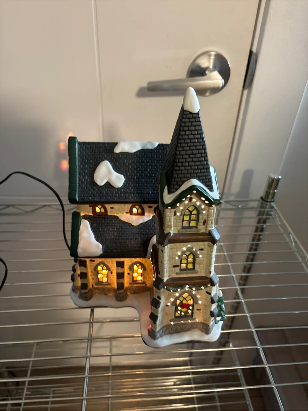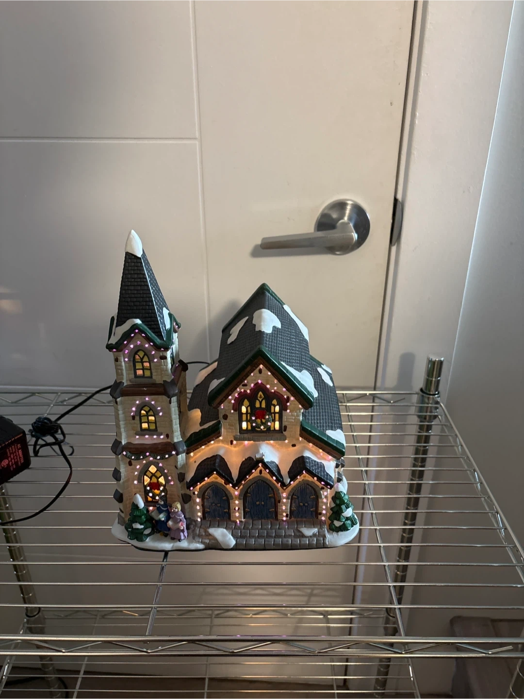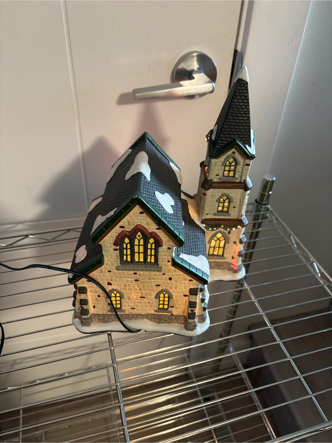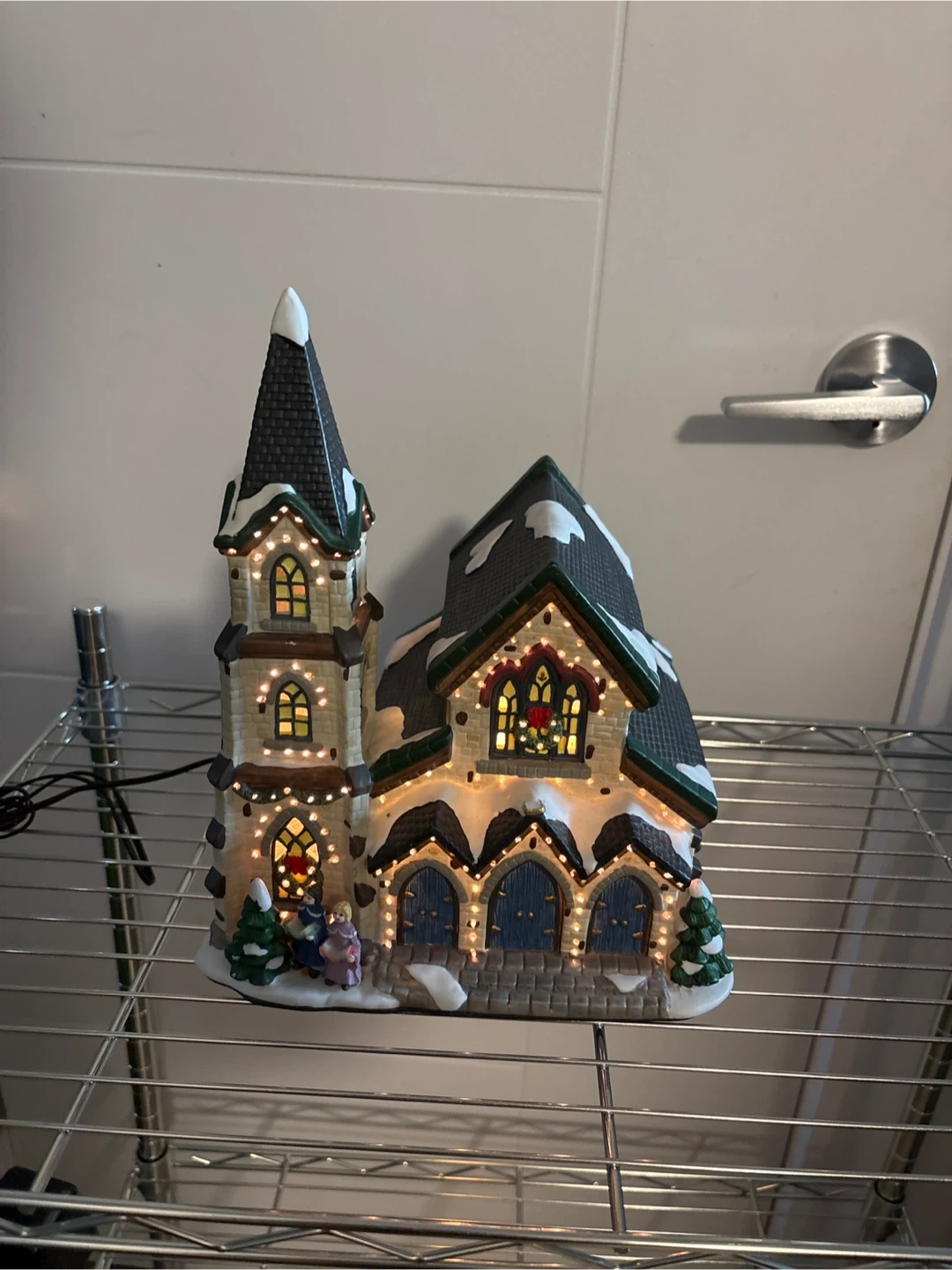 106This is a charming Christmas village church with LED lights. It's perfect for adding a festive touch to your holiday decor! The church is in great condition and ready to brighten up your home
