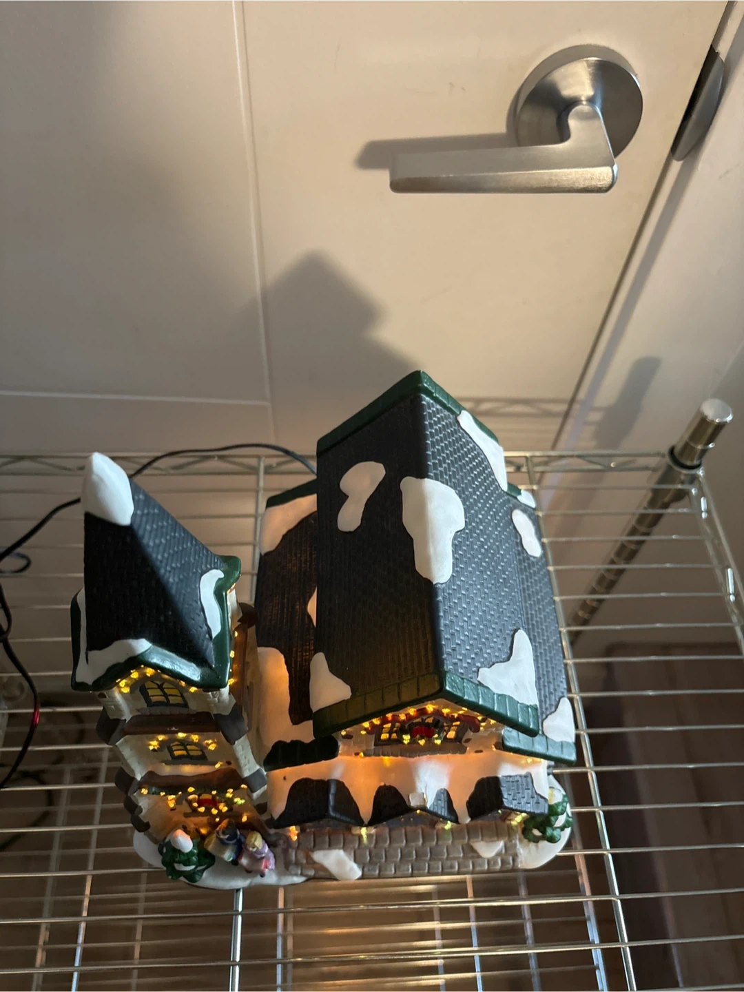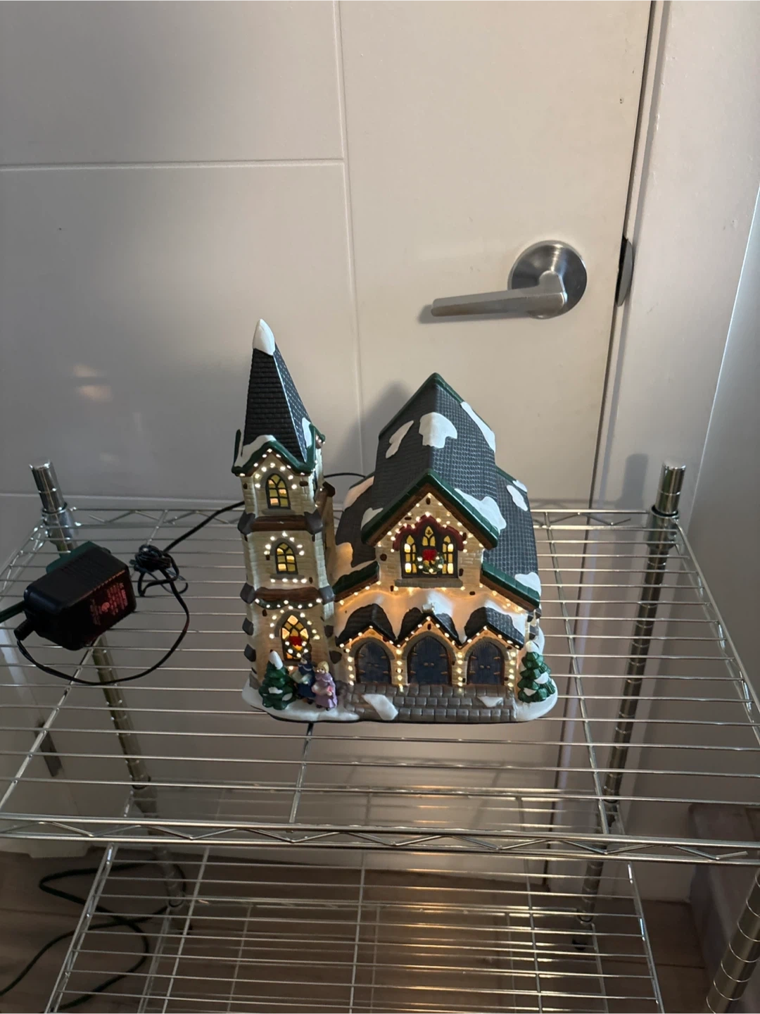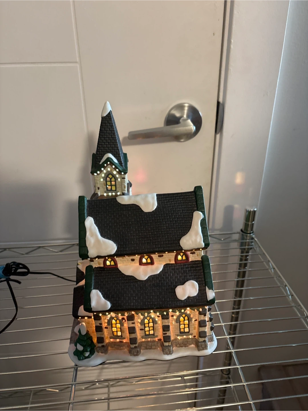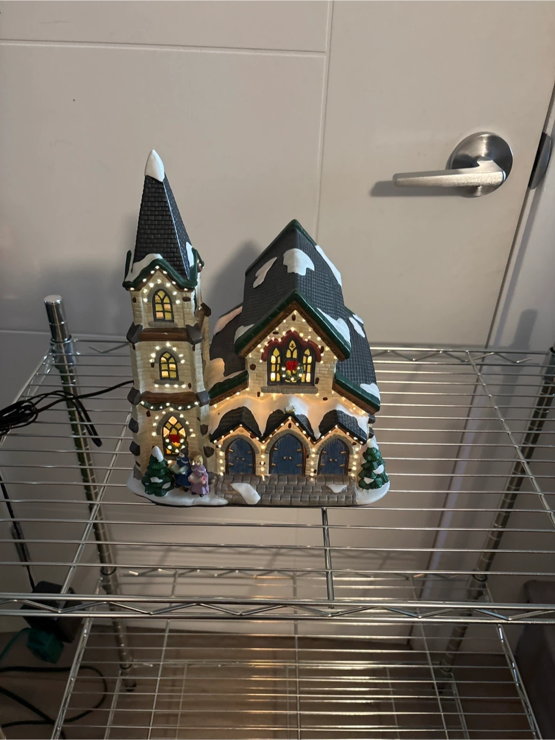 106This is a charming Christmas village church with LED lights. It's perfect for adding a festive touch to your holiday decor! The church is in great condition and ready to brighten up your home