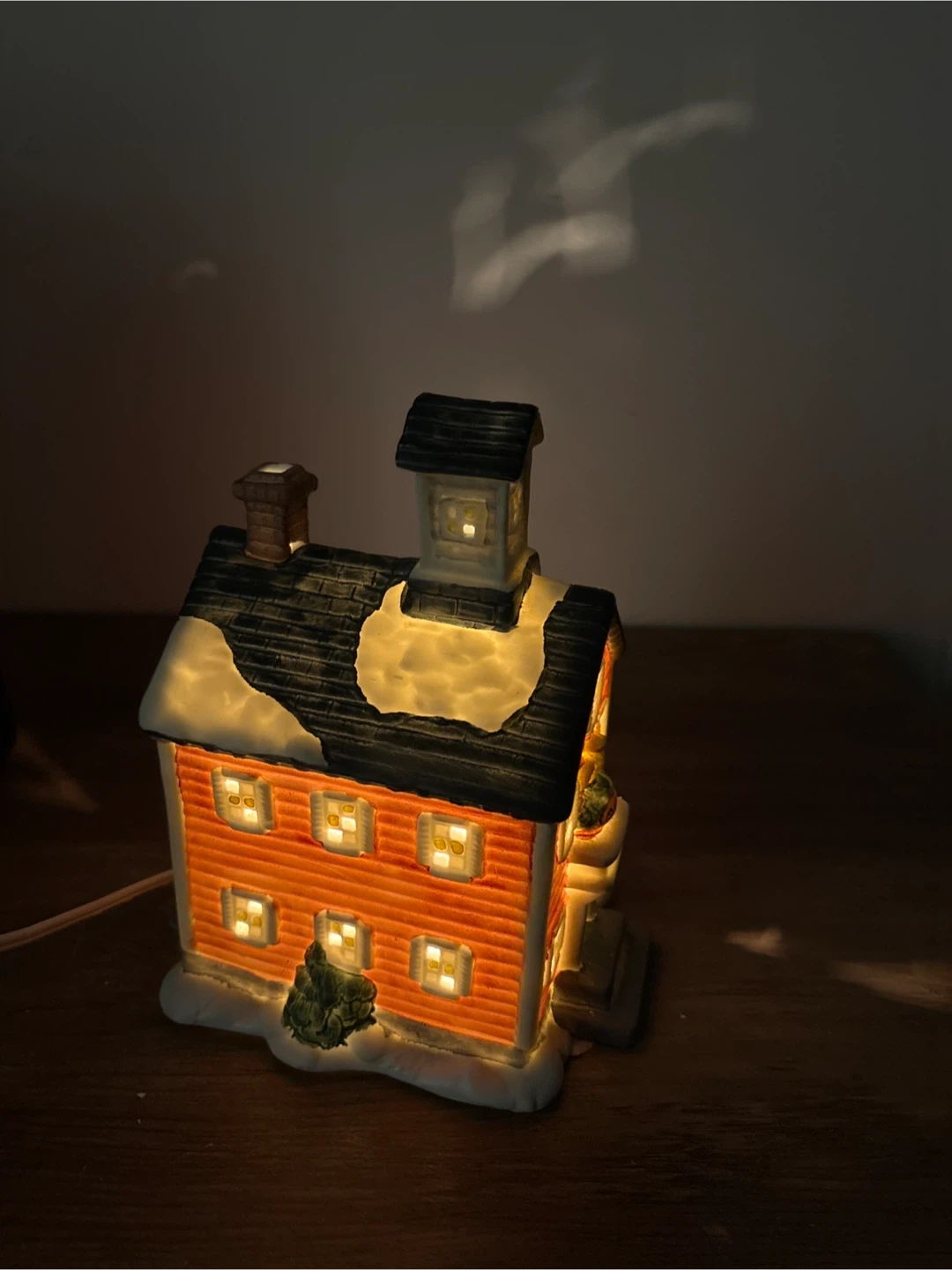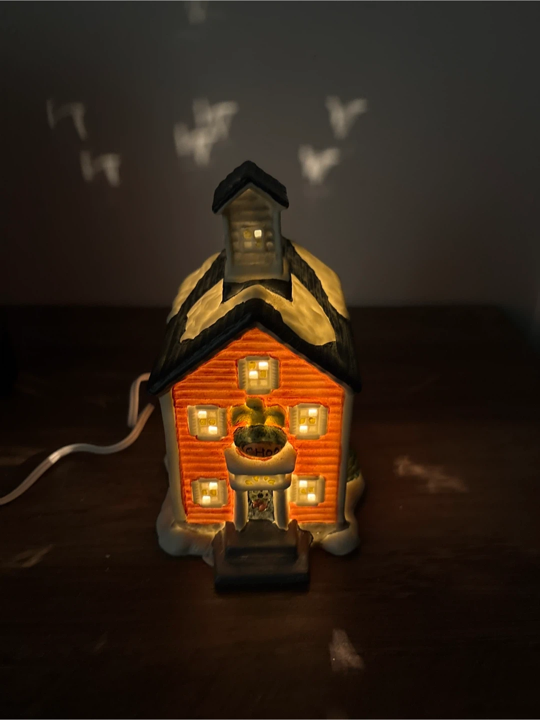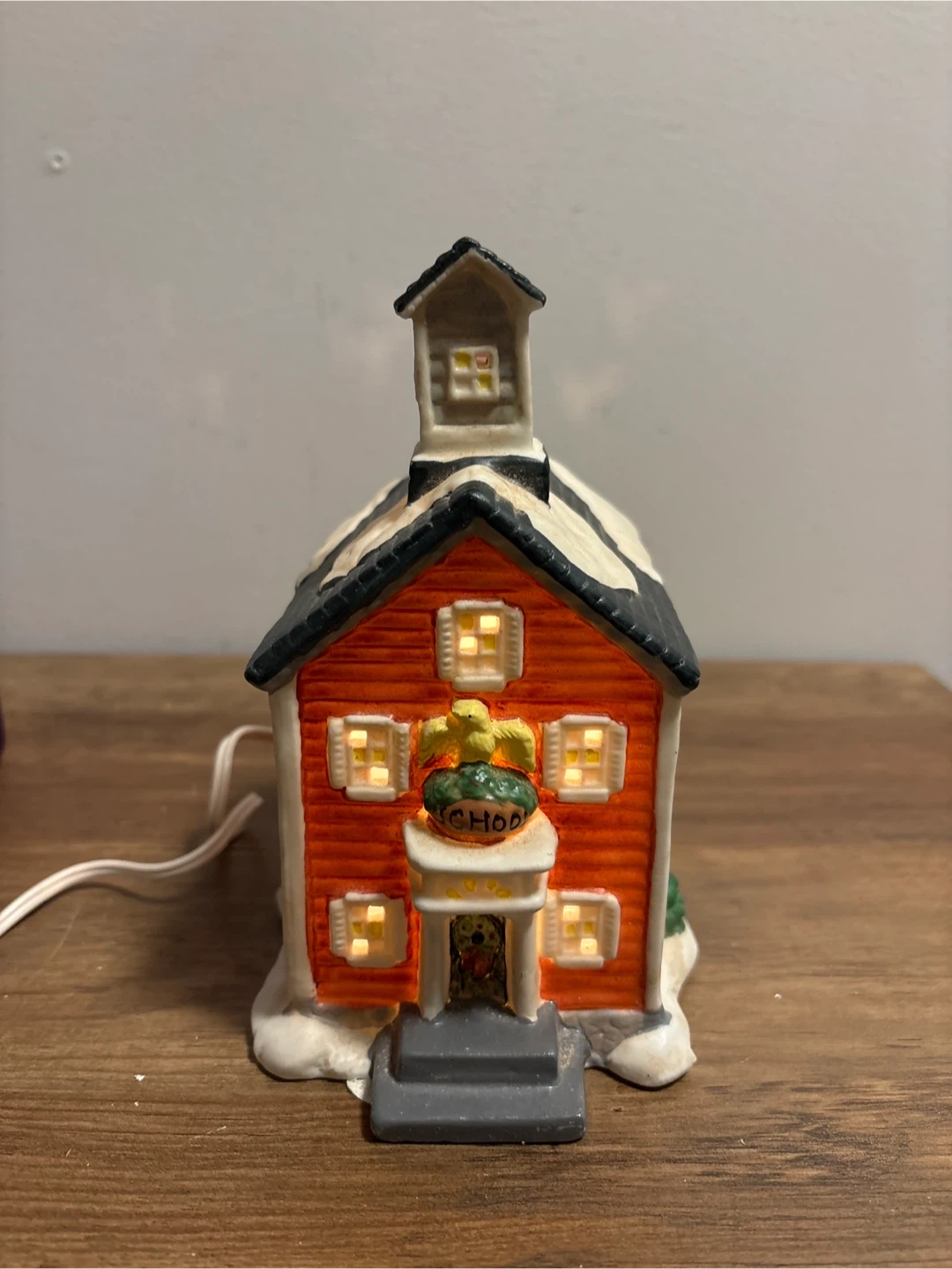 106A charming light-up schoolhouse figurine that would be a great addition to any Christmas village display or holiday decor! The warm glow from the windows creates a cozy and festive atmosphere