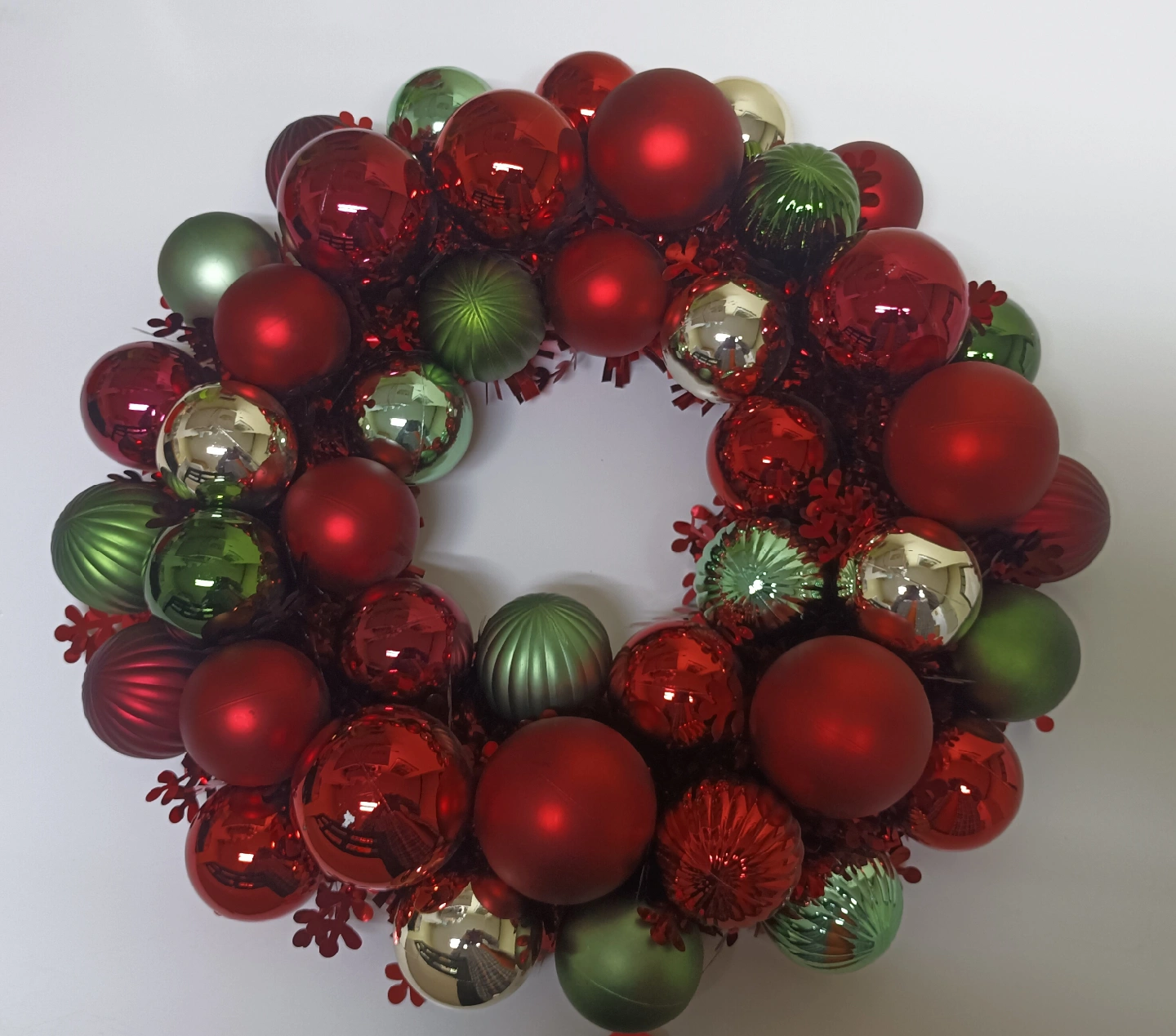 Festive Christmas wreath featuring red, green, and silver ornaments! Perfect for adding a touch of holiday cheer to your home