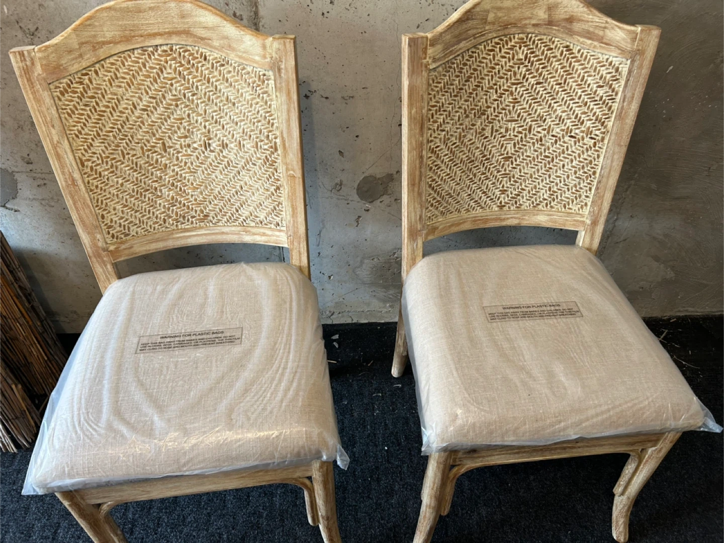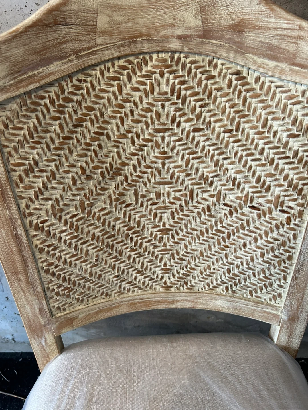 Selling of dining chairs with wicker backs. They are in excellent condition and feature a neutral-toned seat cushion. Perfect for adding a touch of rustic charm to your dining space! (100.00 each)