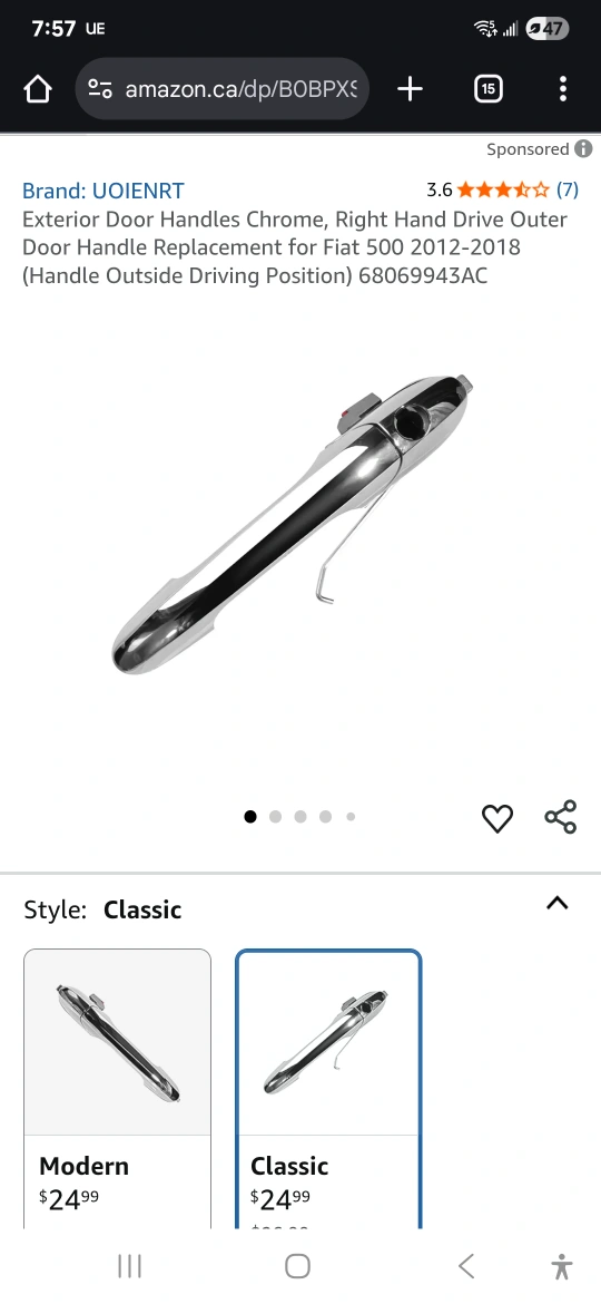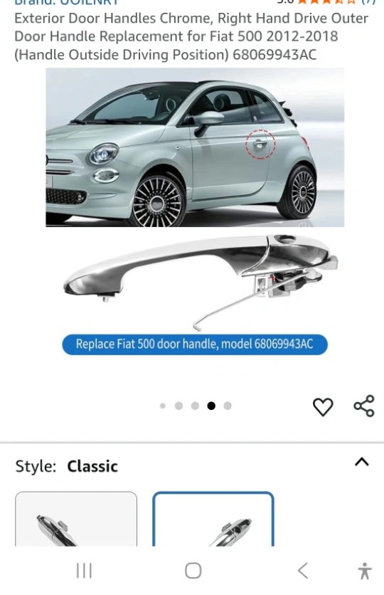 Selling a UOENRT chrome exterior door handle, designed as a right-hand drive outer door handle replacement for Fiat 500 models from 2012-2018. It's a classic style handle with model number 68069943AC. Perfect for replacing a damaged or worn-out handle!