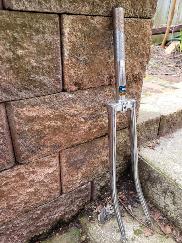 Various Chrome forks AKISU Vintage chrome NOS inch diameter 8 inches high steerer tube. Fits 27 or 700c wheel. Several available. I have 2 sets of NOS chrome forks for regular cantilever/triangle brakes. Mountain bike forks for u-brakes. 6 sets available. New Old stock. Let me know if you're interested!