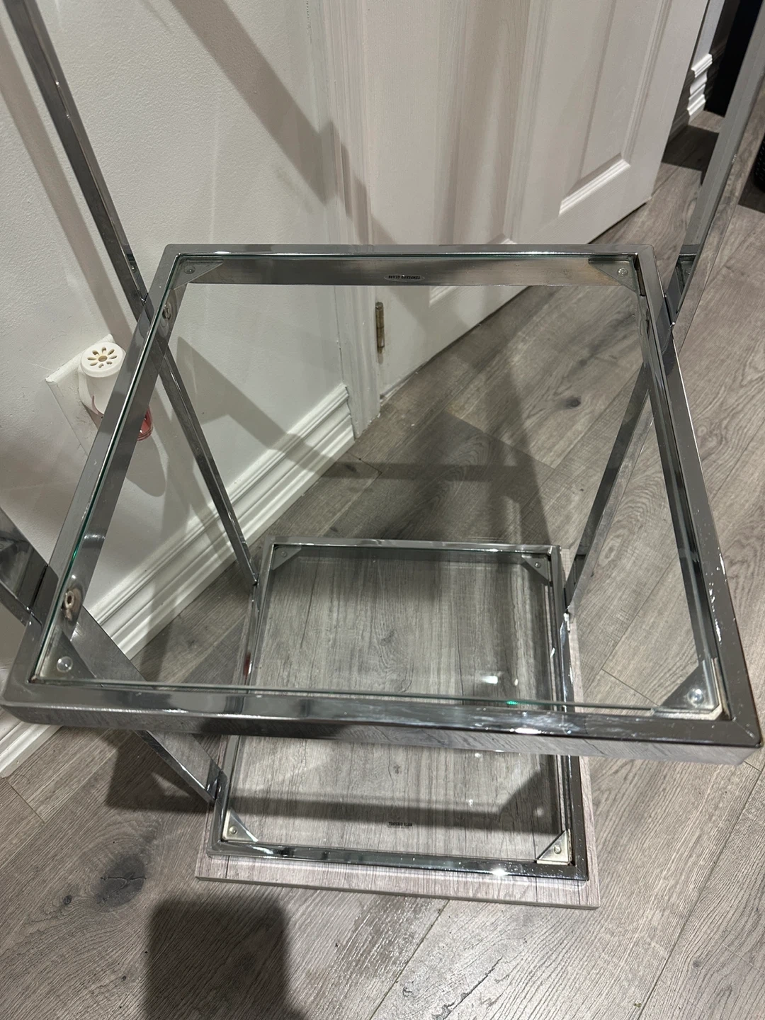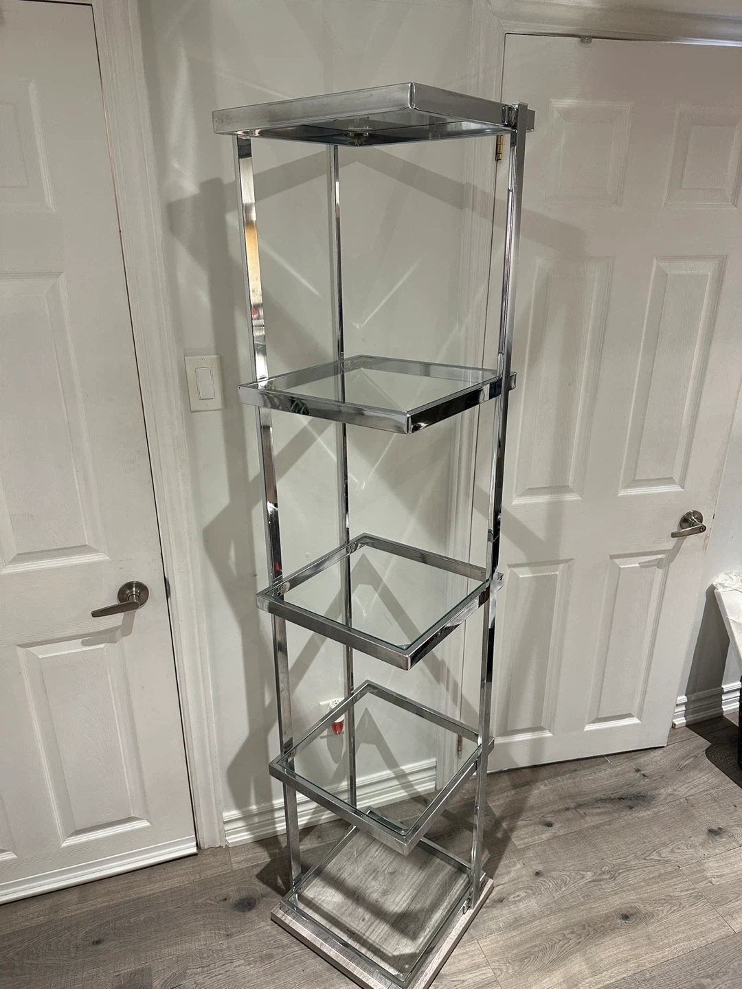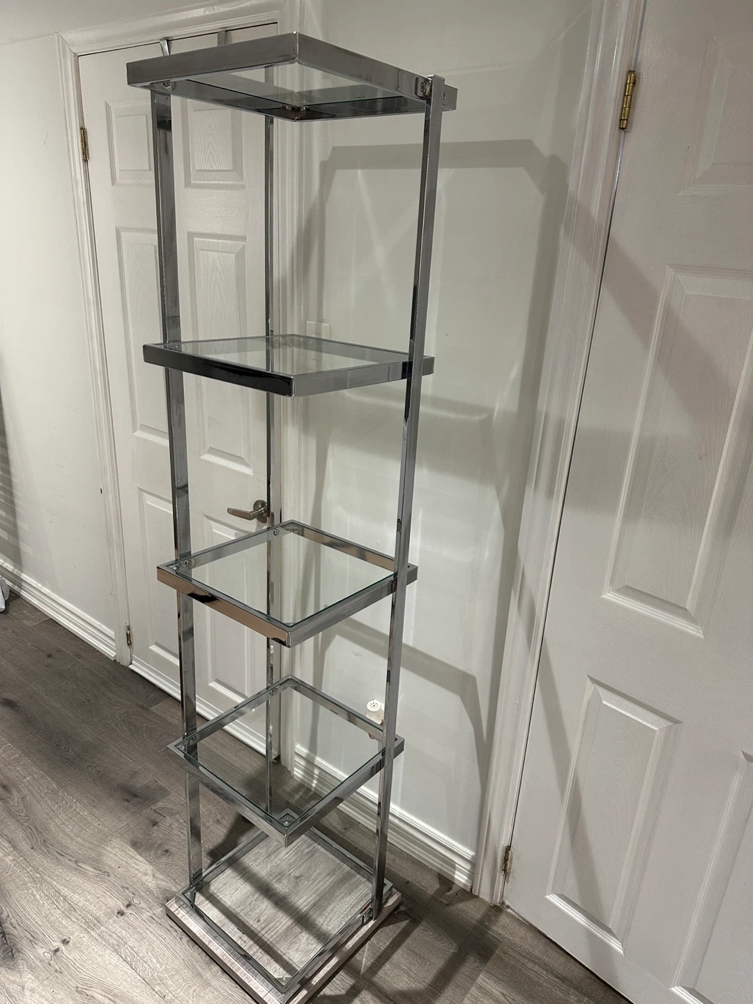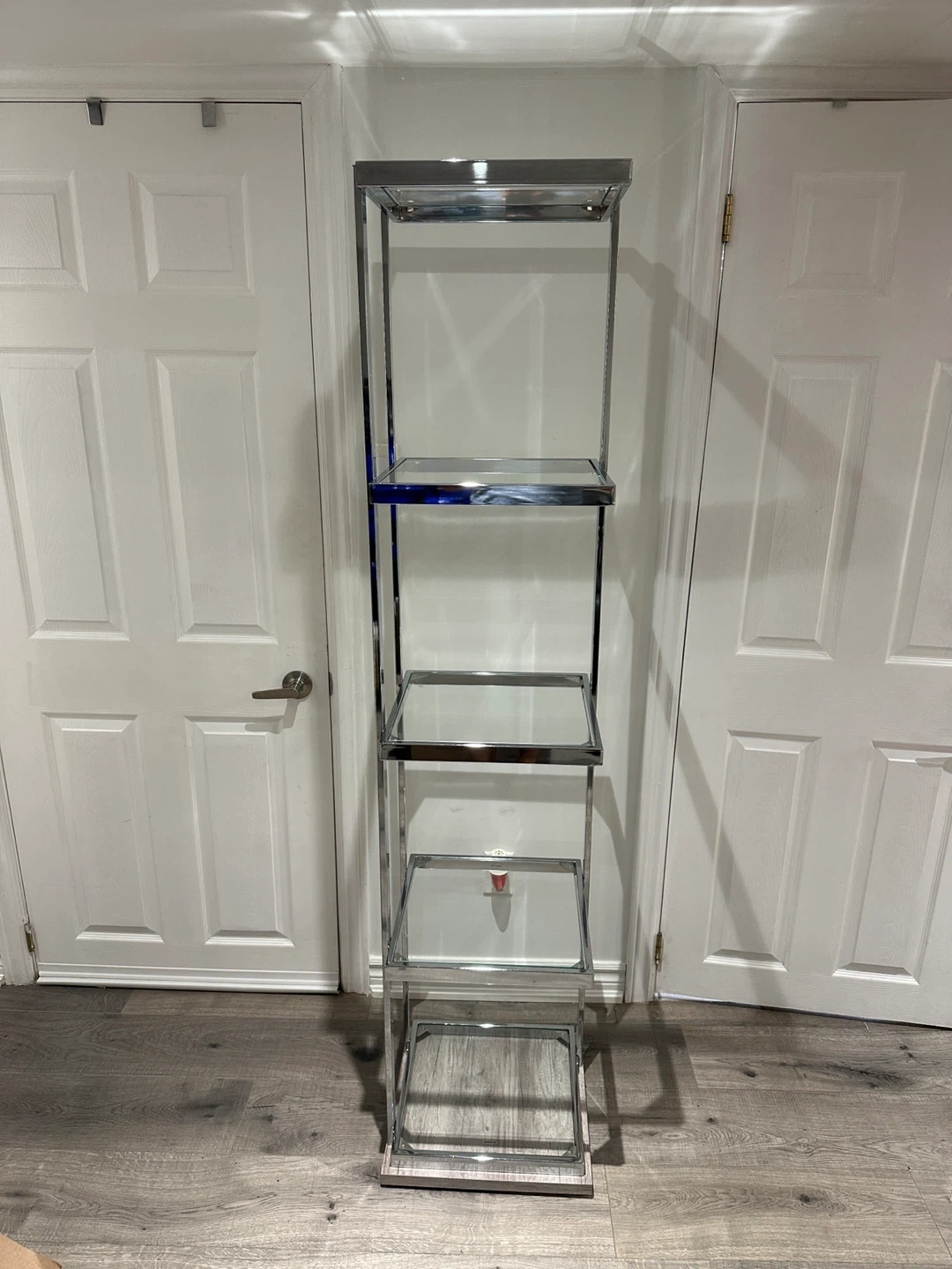 This chrome shelving unit features glass shelves and a modern design. It's perfect for displaying your favourite items or adding some extra storage to any room in your home. It's in great condition and ready for a new home!