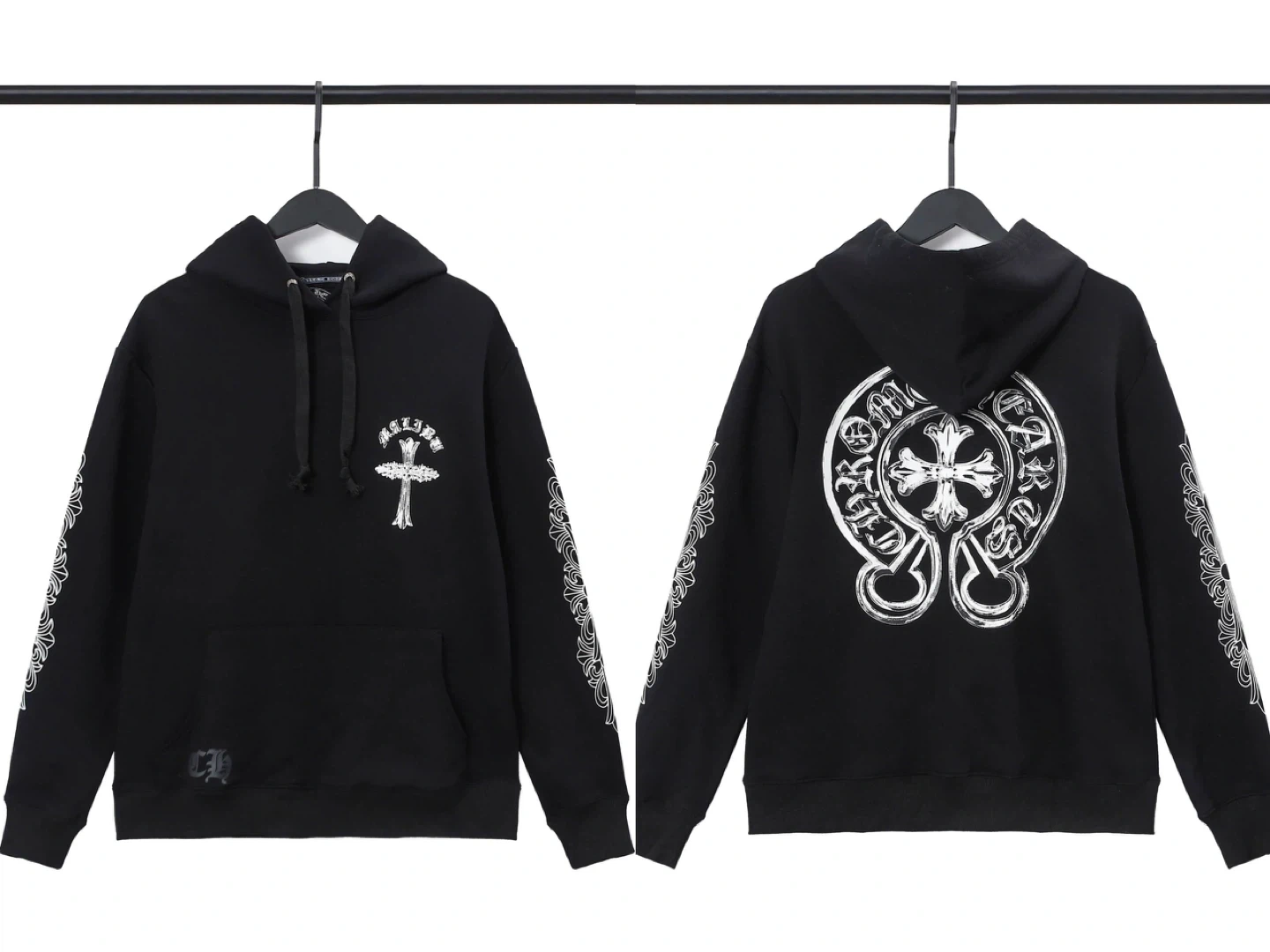 15Selling a Chrome Hearts black hoodie. It features the iconic cross design on the front and back, with detailed patterns along the sleeves. Perfect for adding a touch of edgy style to your wardrobe!