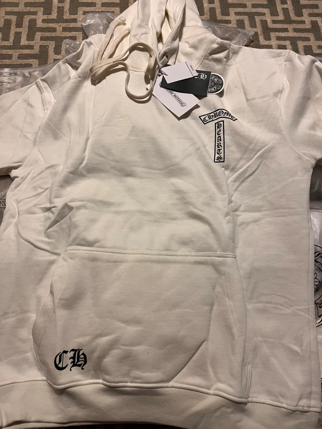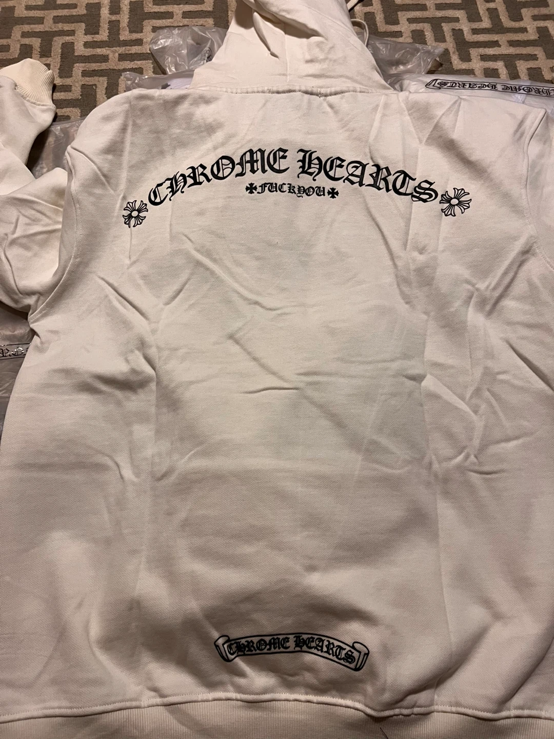 Selling a Chrome Hearts hoodie in white. It features the Chrome Hearts logo on the front and back. The material feels soft and comfortable, perfect for everyday wear!