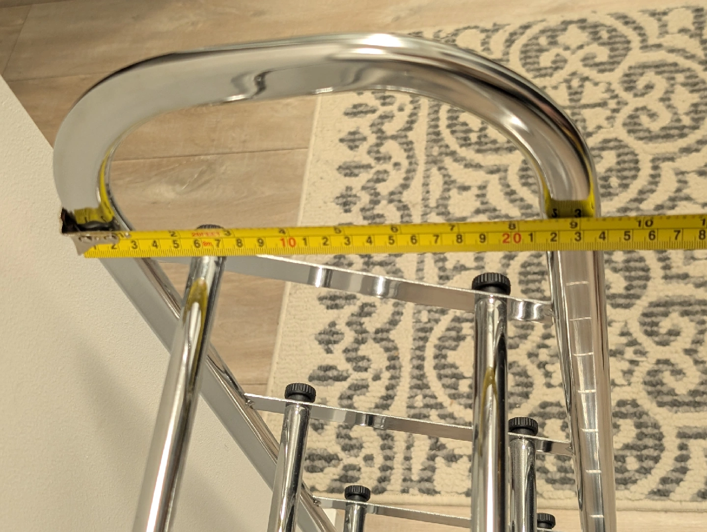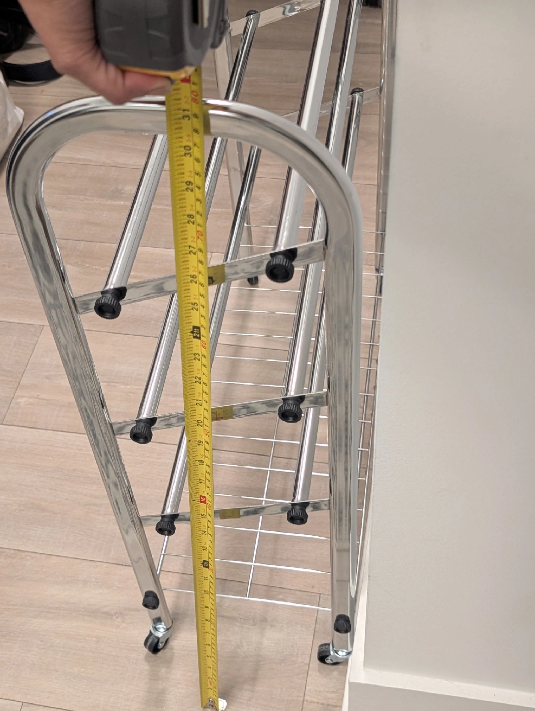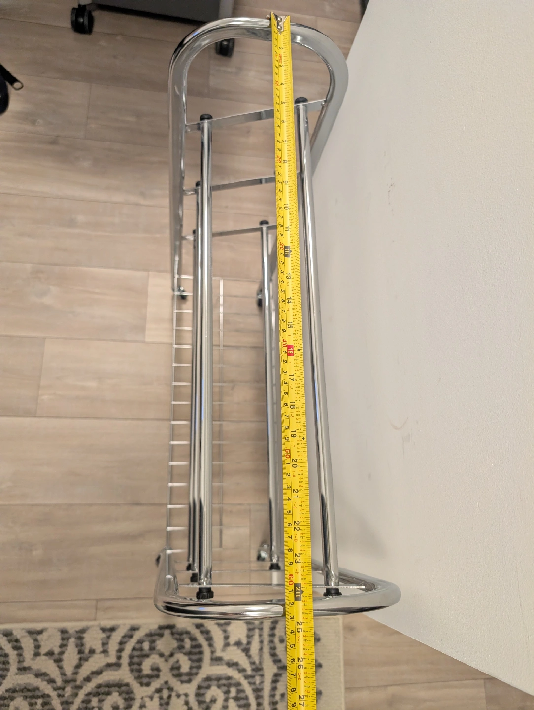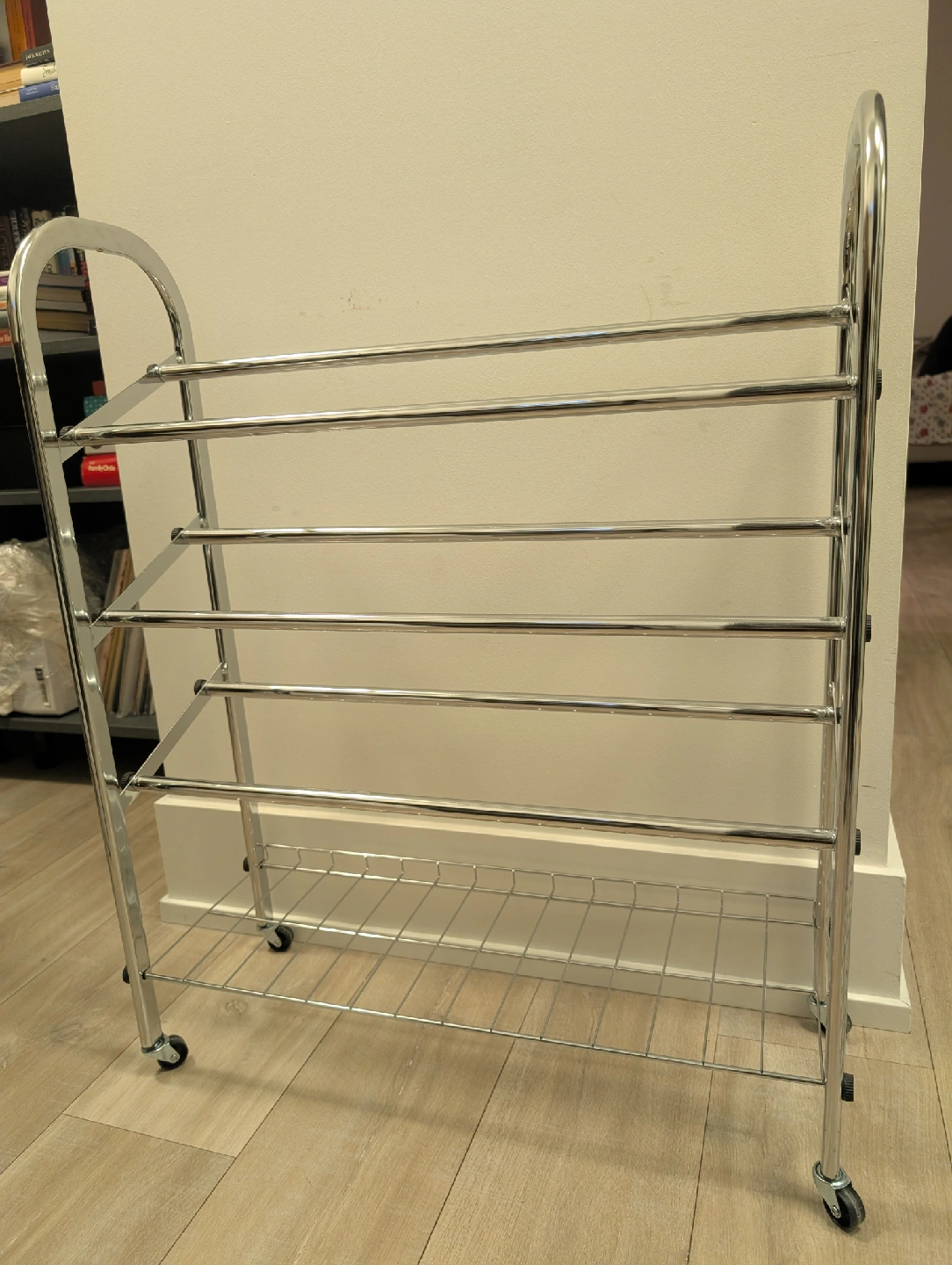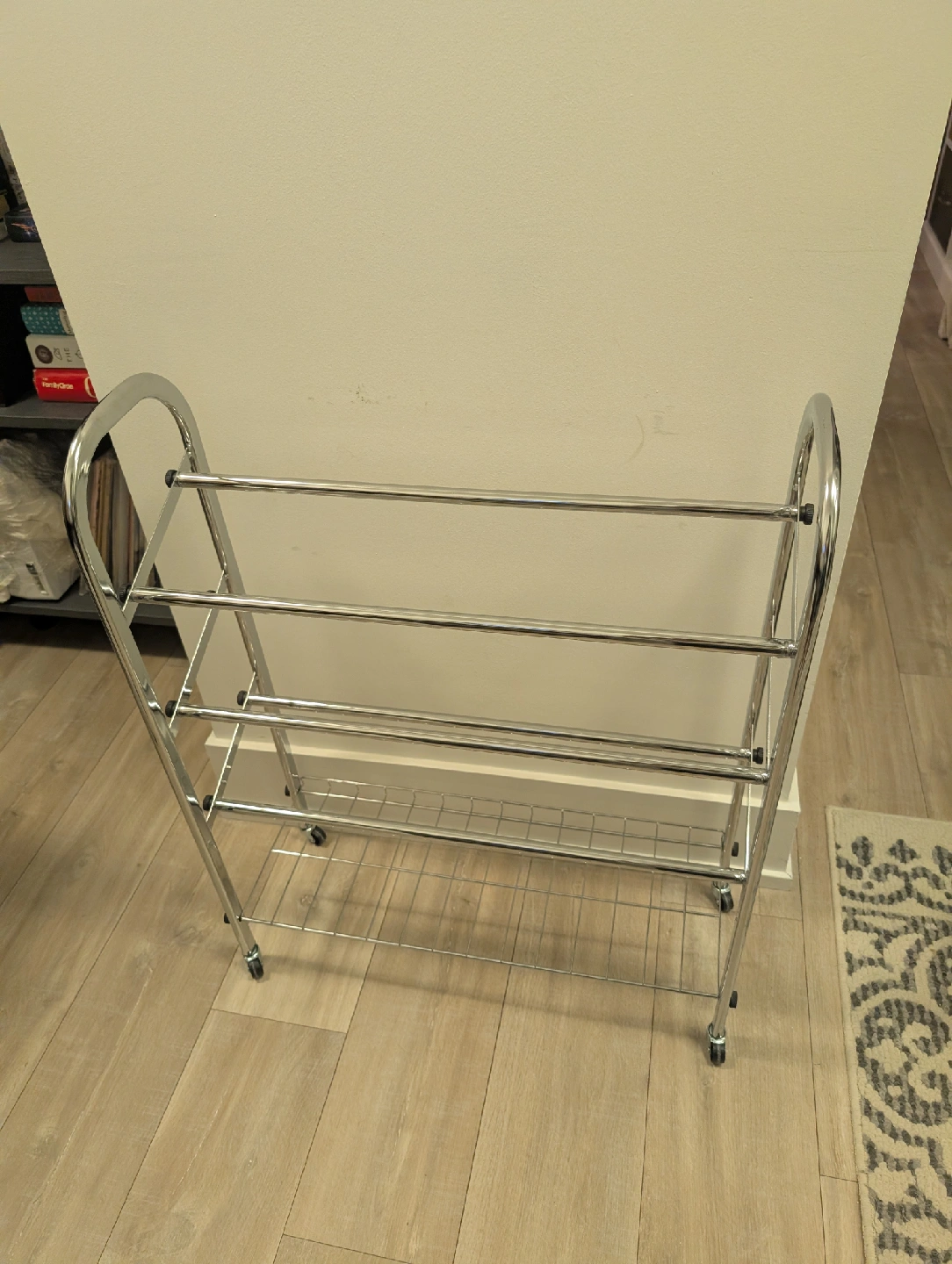 70Band new Chrome shoe rack with wheels for easy moving! It measures about 31 inches in height and 27 inches in width. Perfect for keeping your shoes organized and tidy.
