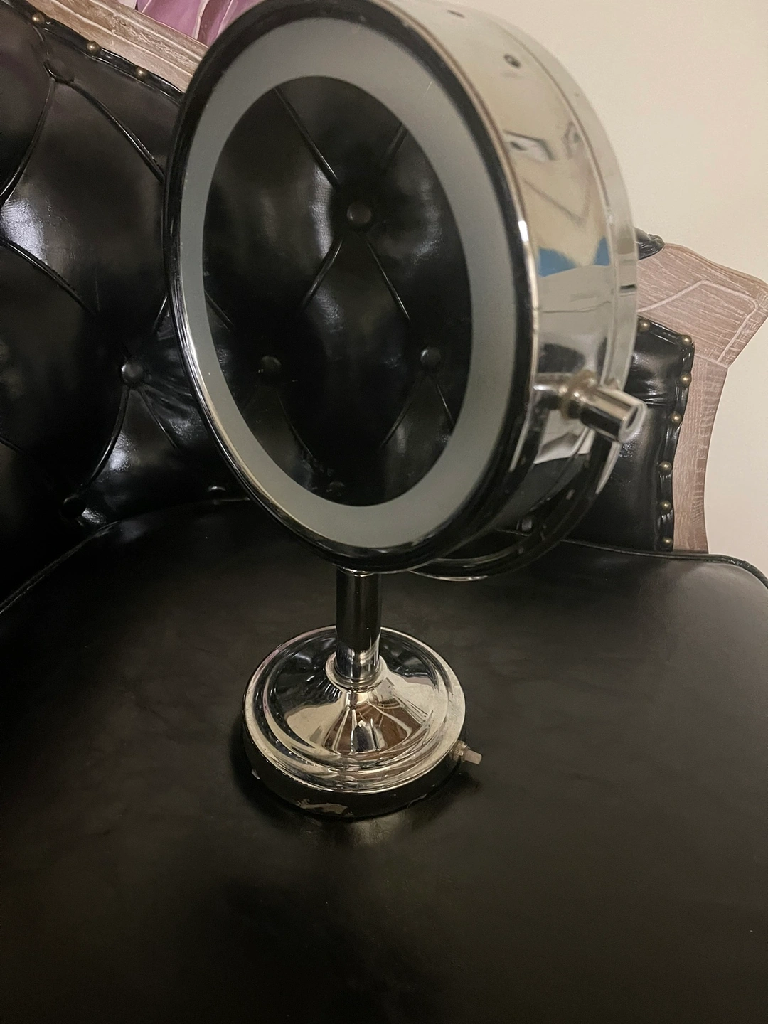 51This is a vanity mirror with a chrome finish. It is round and sits on a stand. also can pick up at bay subway station