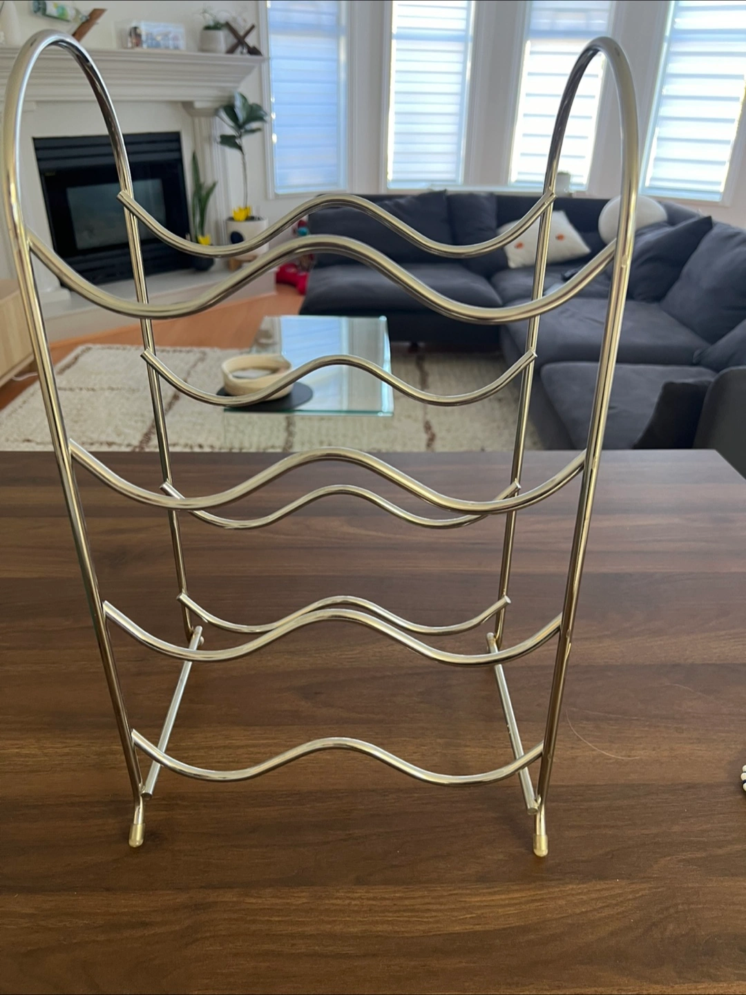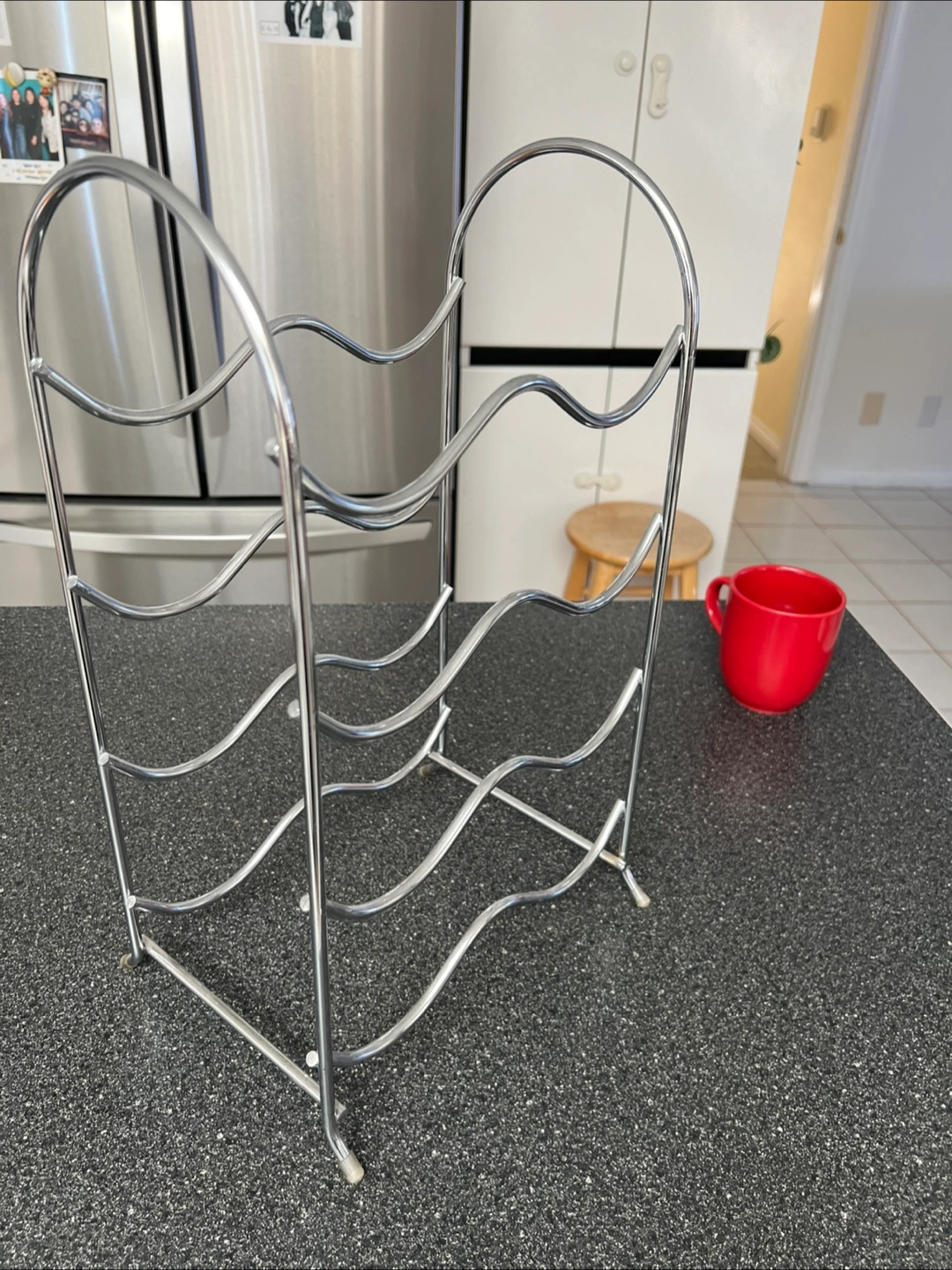 Selling a chrome wine rack that holds up to 6 bottles. It's in great shape and would look lovely in any home. Perfect for organizing your favourite wines!
