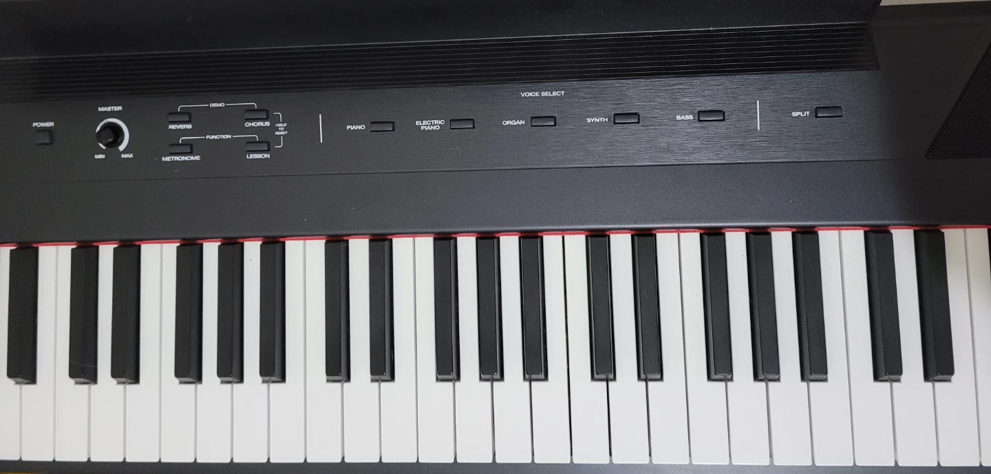 This is an Alesis Recital digital piano with 88 full-size keys. It features multiple voices like piano, electric piano, organ, and synth. It also includes a metronome function and lesson mode. It's great for learning to play!