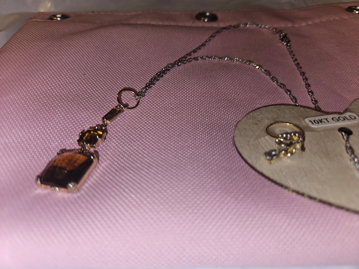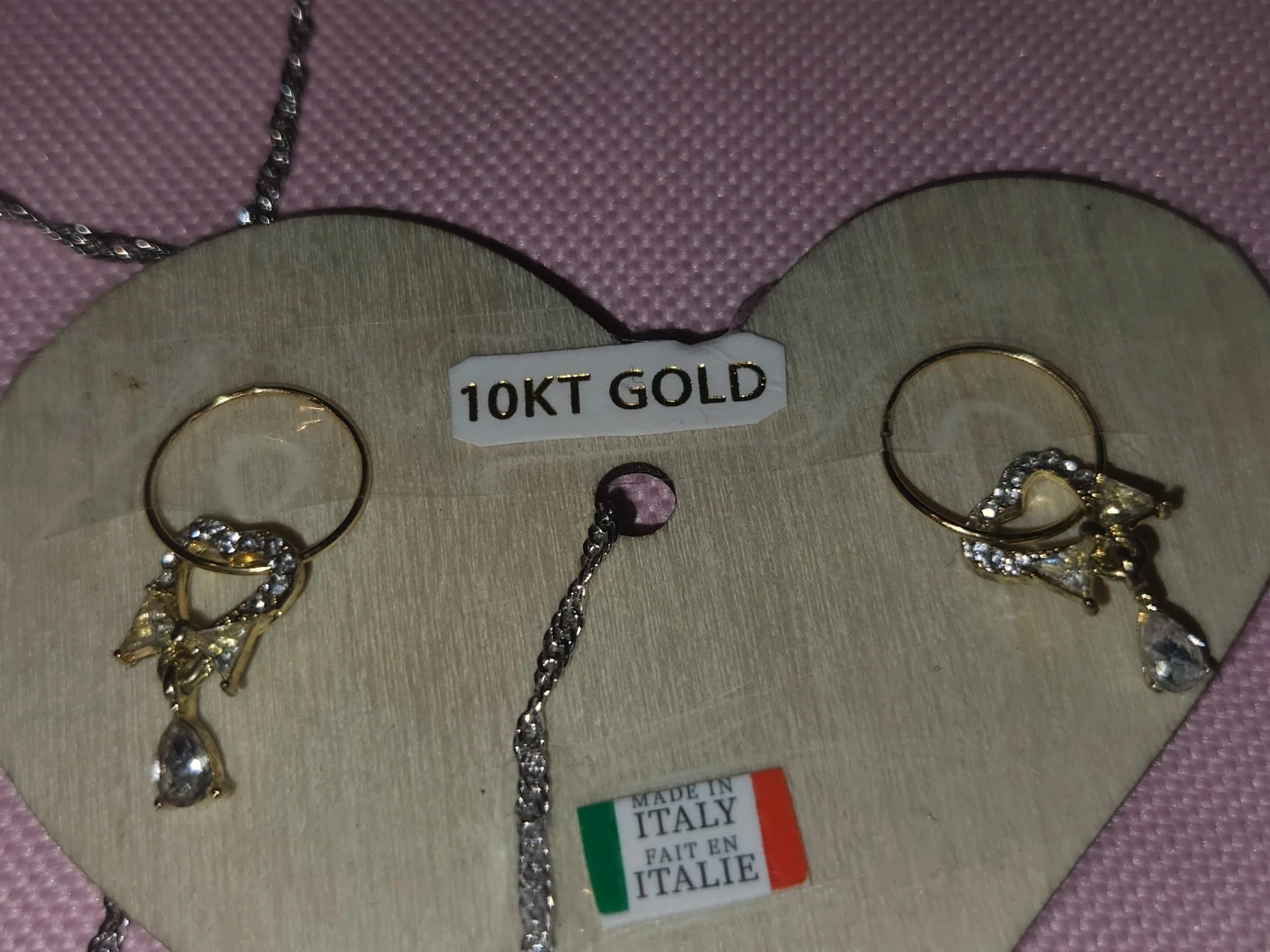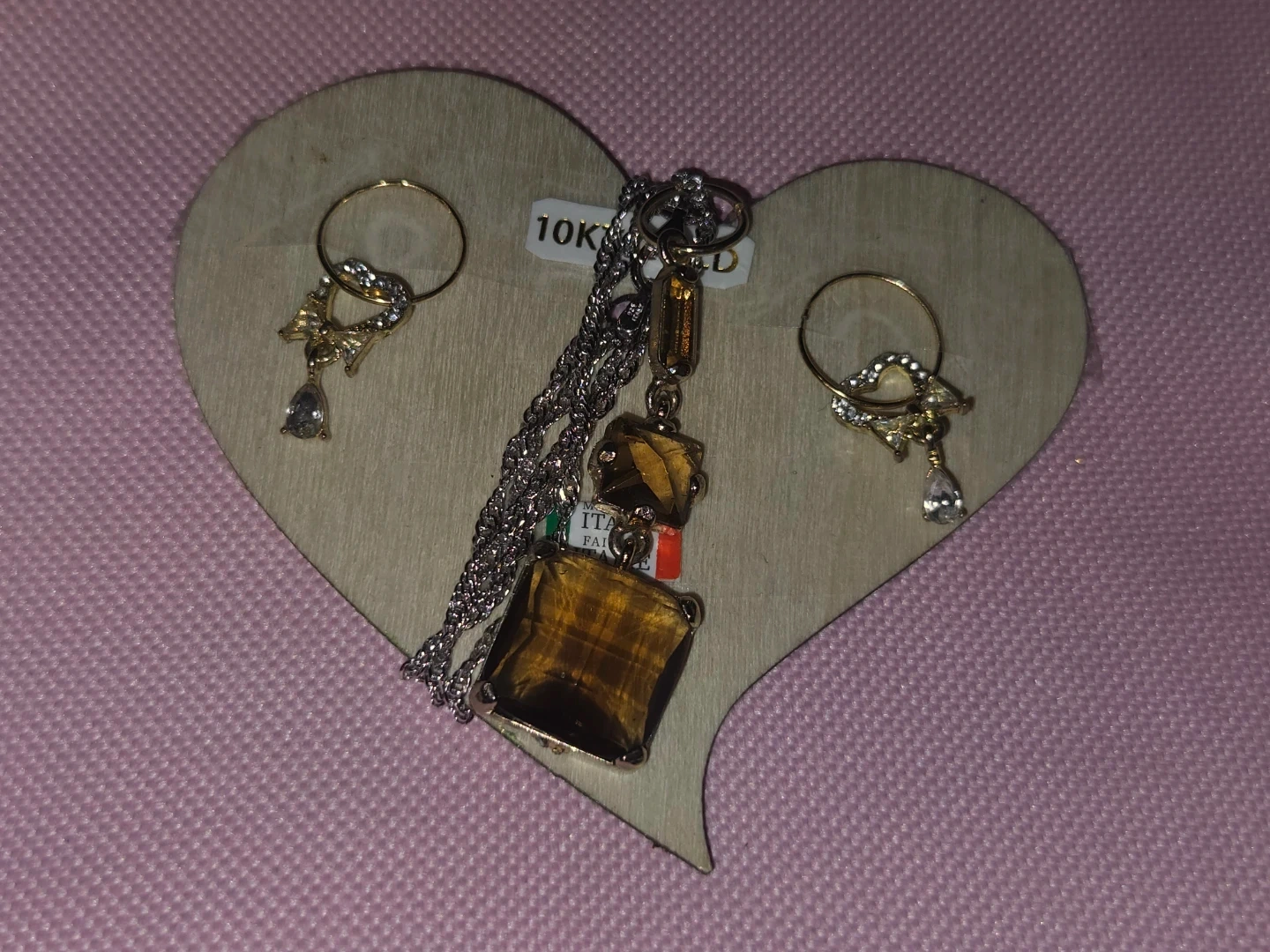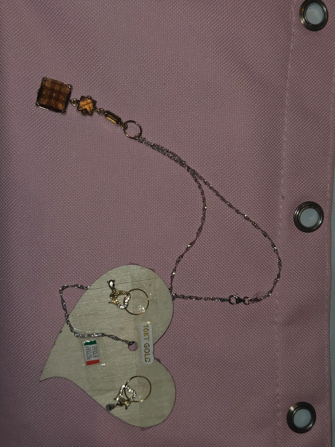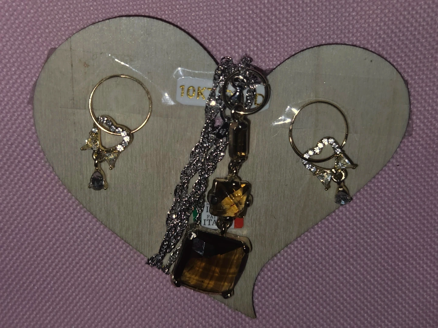 Here's a lovely 10KT gold earrings And S925 Italian silver necklace features a unique pendant with brown Australian Crystals stones, and the earrings have a delicate design with small stones. They're both in great condition and ready to add a touch of elegance to any outfit.