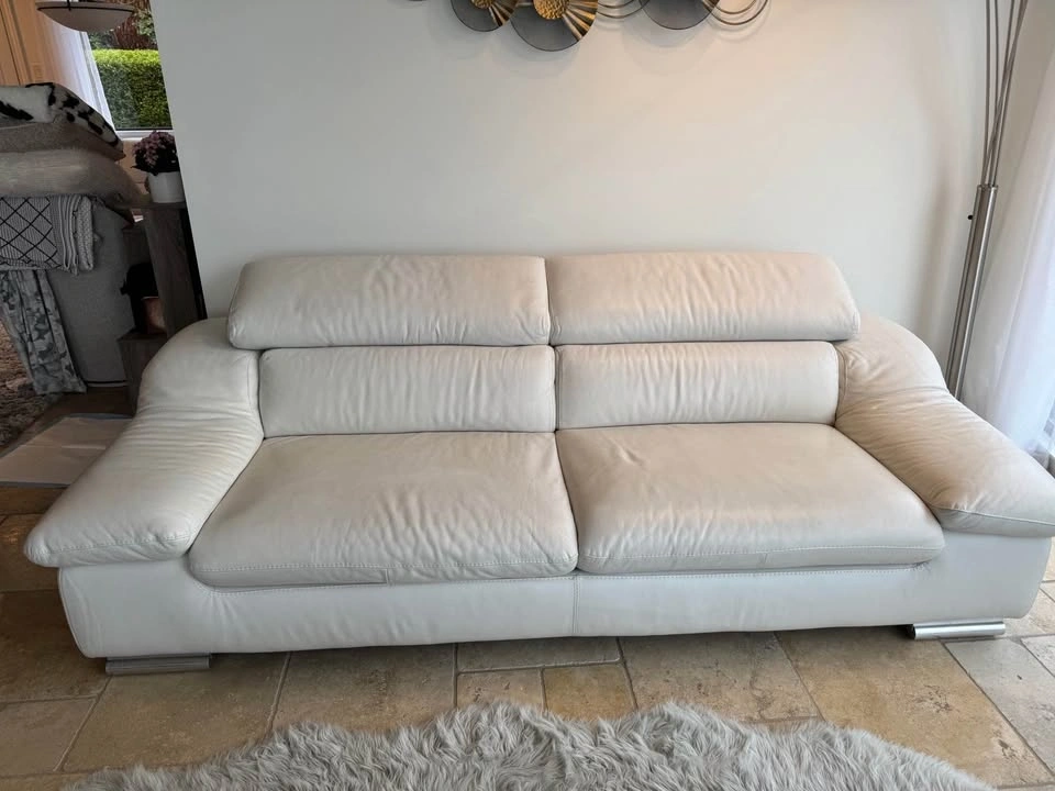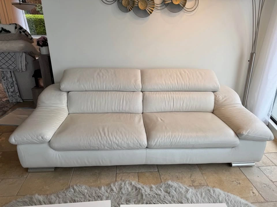 Beautiful Ginger Jar Italian living room set. Has 2 white leather couches, 2 arm chairs and a coffee table. Adjustable headrests. Originally bought from Ginger Jar in North Vancouver for $14,000. Great condition. Works out to be $550 per piece.
