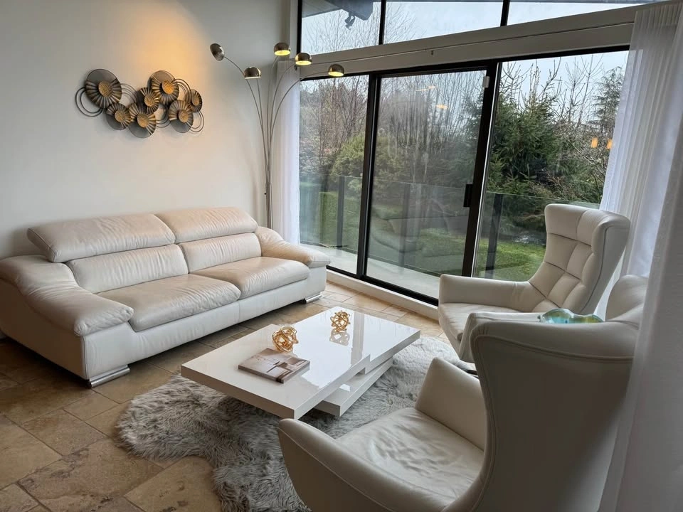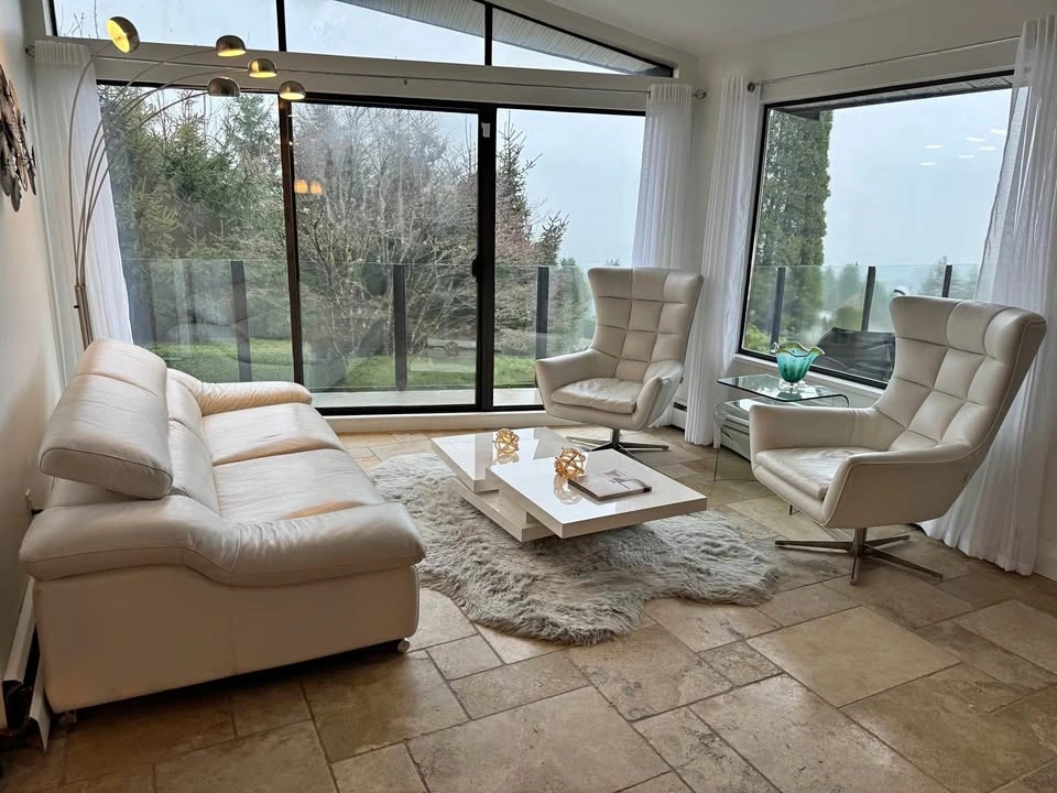 Beautiful Ginger Jar Italian living room set. Has 2 white leather couches, 2 arm chairs and a coffee table. Adjustable headrests. Originally bought from Ginger Jar in North Vancouver for $14,000. Great condition. Works out to be $550 per piece.