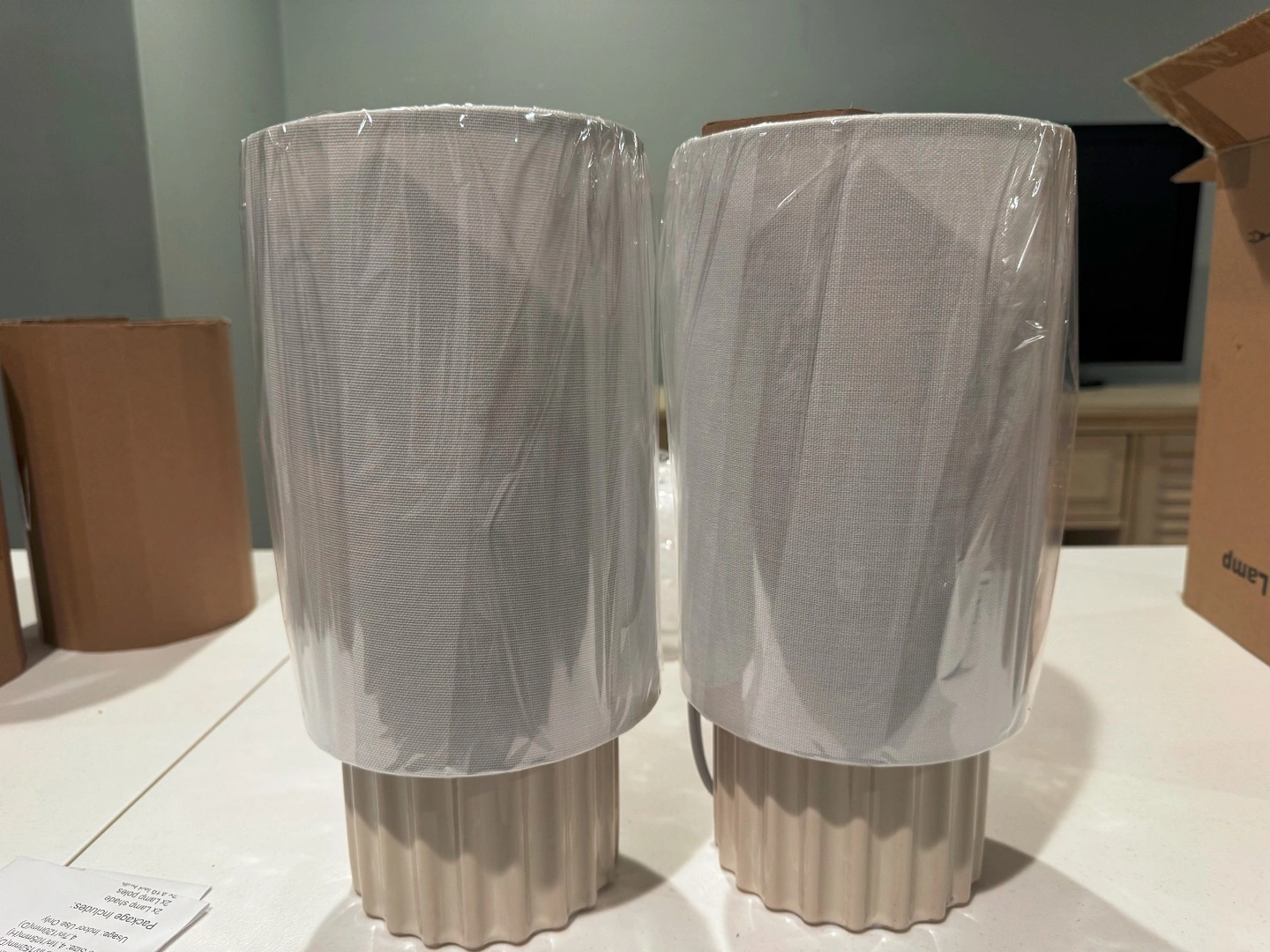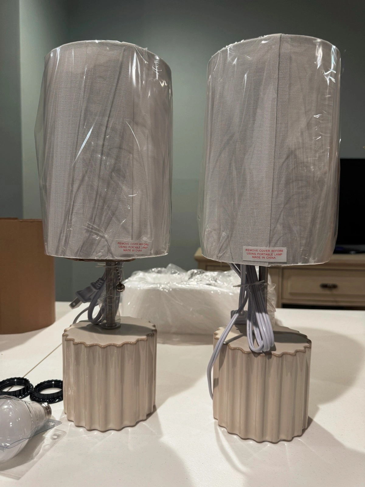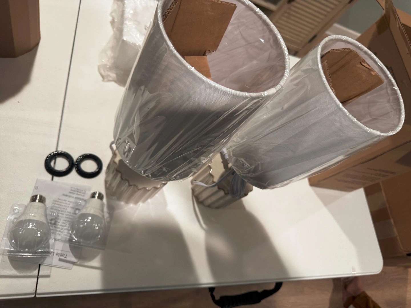 New. Set of 2 Threshold table lamps. Modern style with a faux marble pattern and drum shades. Includes lamp shades. Natural/neutral color temperature (3500-4500K). Corded power source, 120V. Energy efficient. Great for bedrooms, living rooms, dining rooms, entryways, studies, or dens.