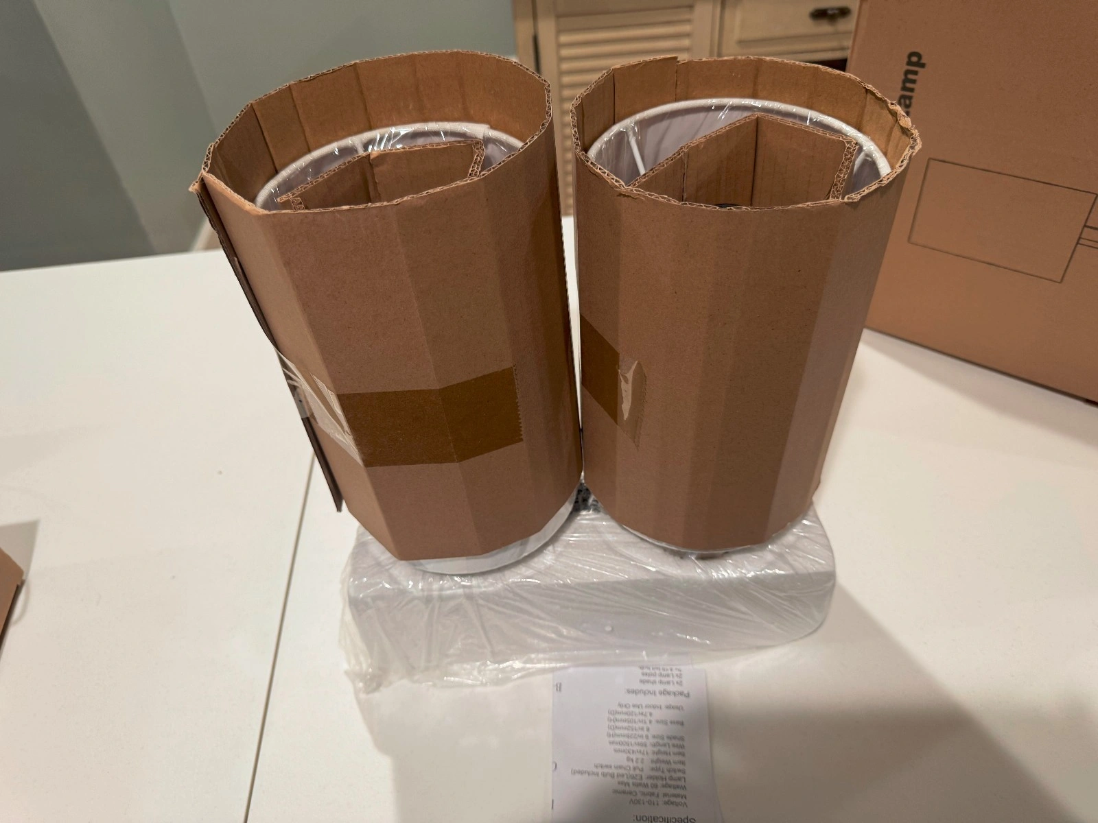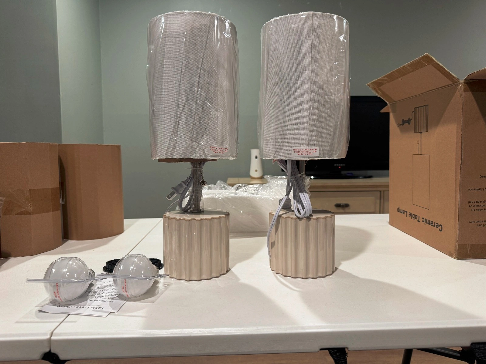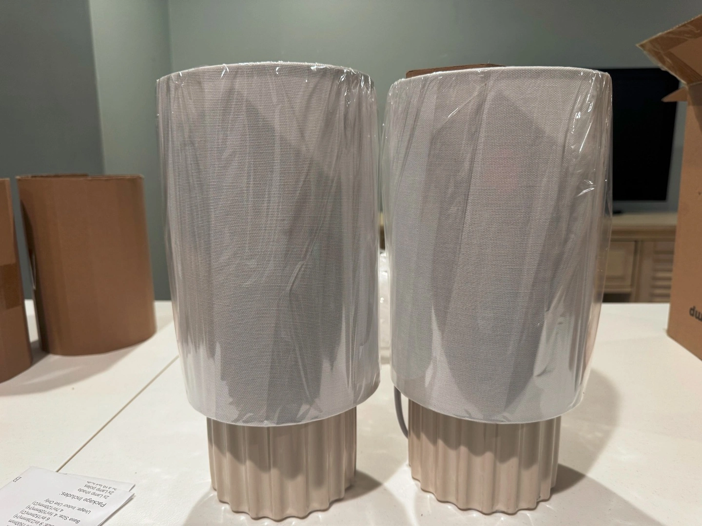 New. Set of 2 Threshold table lamps. Modern style with a faux marble pattern and drum shades. Includes lamp shades. Natural/neutral color temperature (3500-4500K). Corded power source, 120V. Energy efficient. Great for bedrooms, living rooms, dining rooms, entryways, studies, or dens.