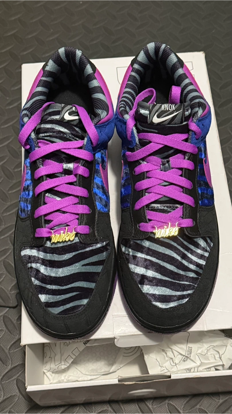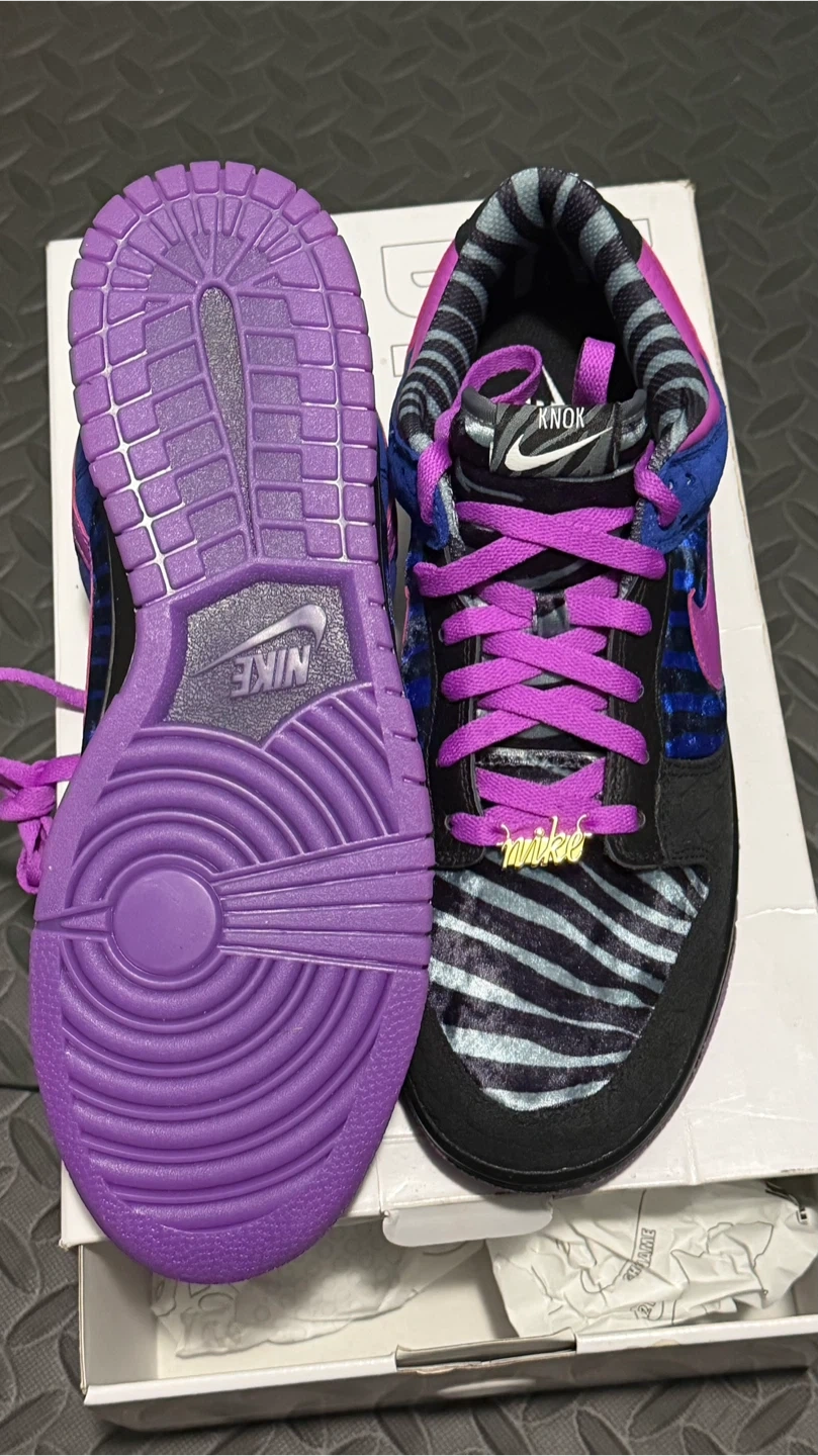 These Nike Dunk Lows feature a unique "Knockout" design with zebra print and blue accents. They have purple laces and gold "Nike" dubraes. The shoe's interior lining is also patterned. These are a statement piece for any sneaker collection!