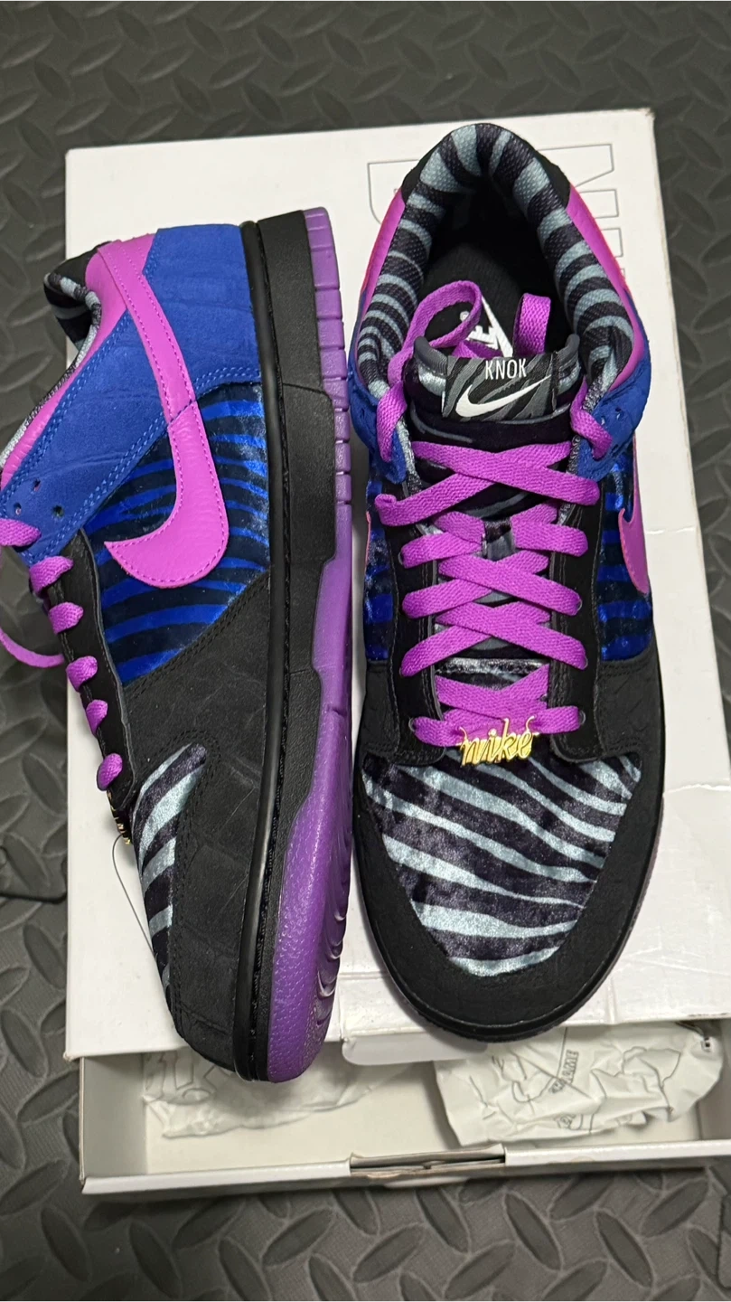 These Nike Dunk Lows feature a unique "Knockout" design with zebra print and blue accents. They have purple laces and gold "Nike" dubraes. The shoe's interior lining is also patterned. These are a statement piece for any sneaker collection!