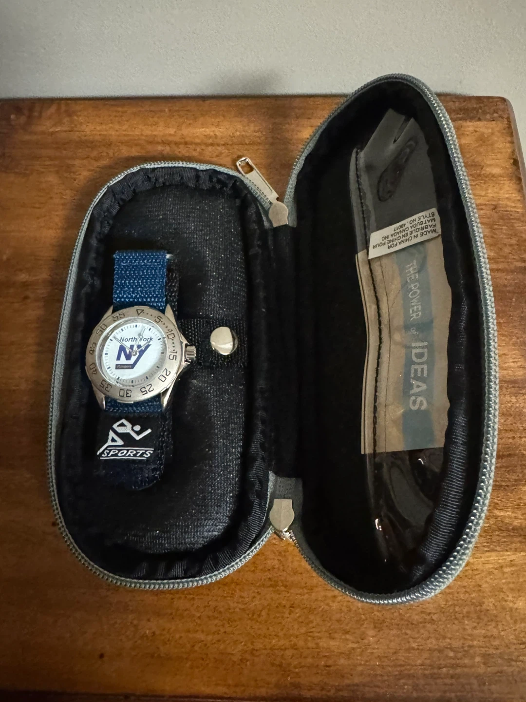 A North York Rangers sports watch with a blue fabric strap. It comes with its original zippered carrying case. The watch face clearly displays the "North York Rangers" logo. Perfect for an alum or proud parent.