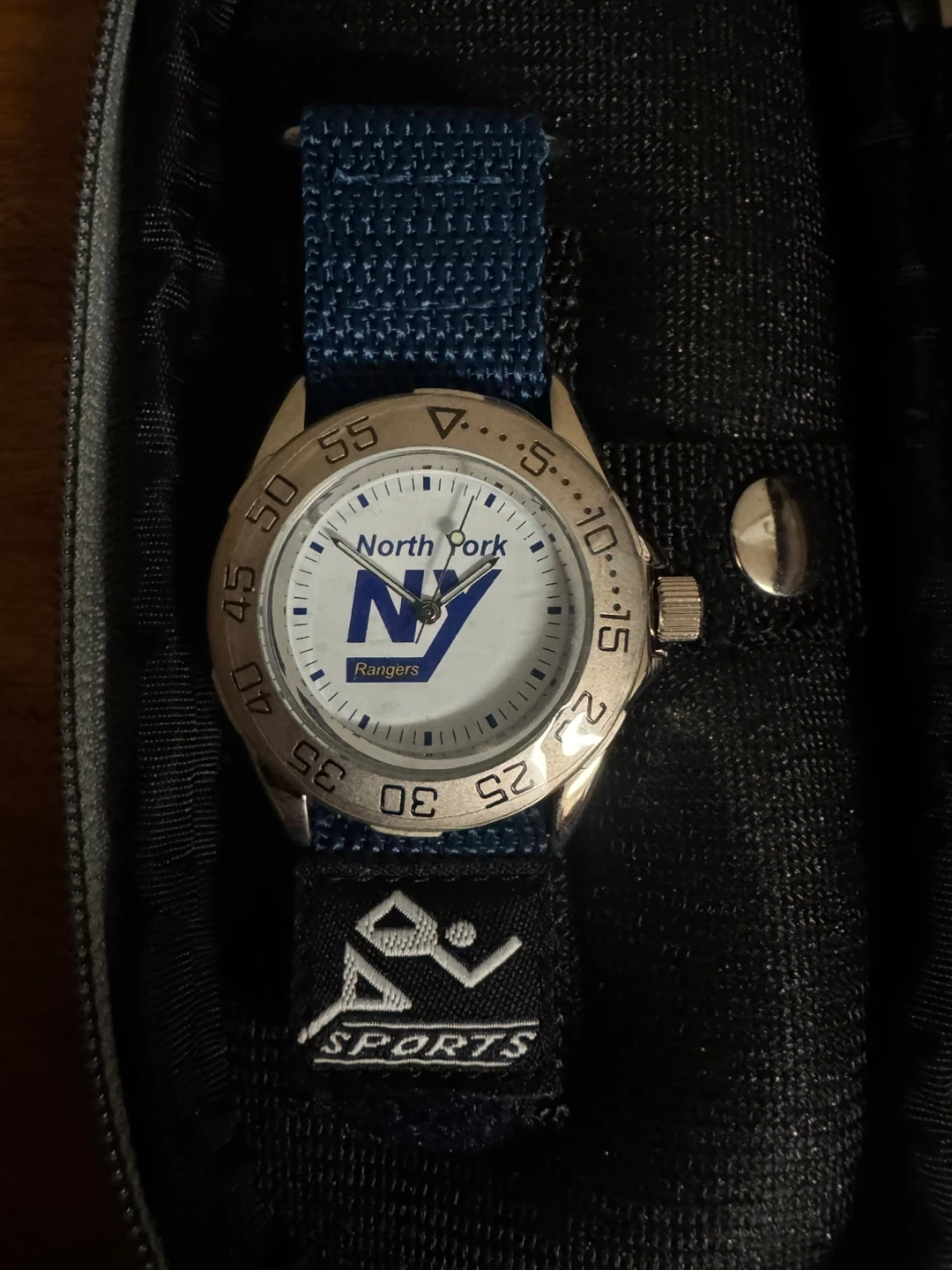 A North York Rangers sports watch with a blue fabric strap. It comes with its original zippered carrying case. The watch face clearly displays the "North York Rangers" logo. Perfect for an alum or proud parent.