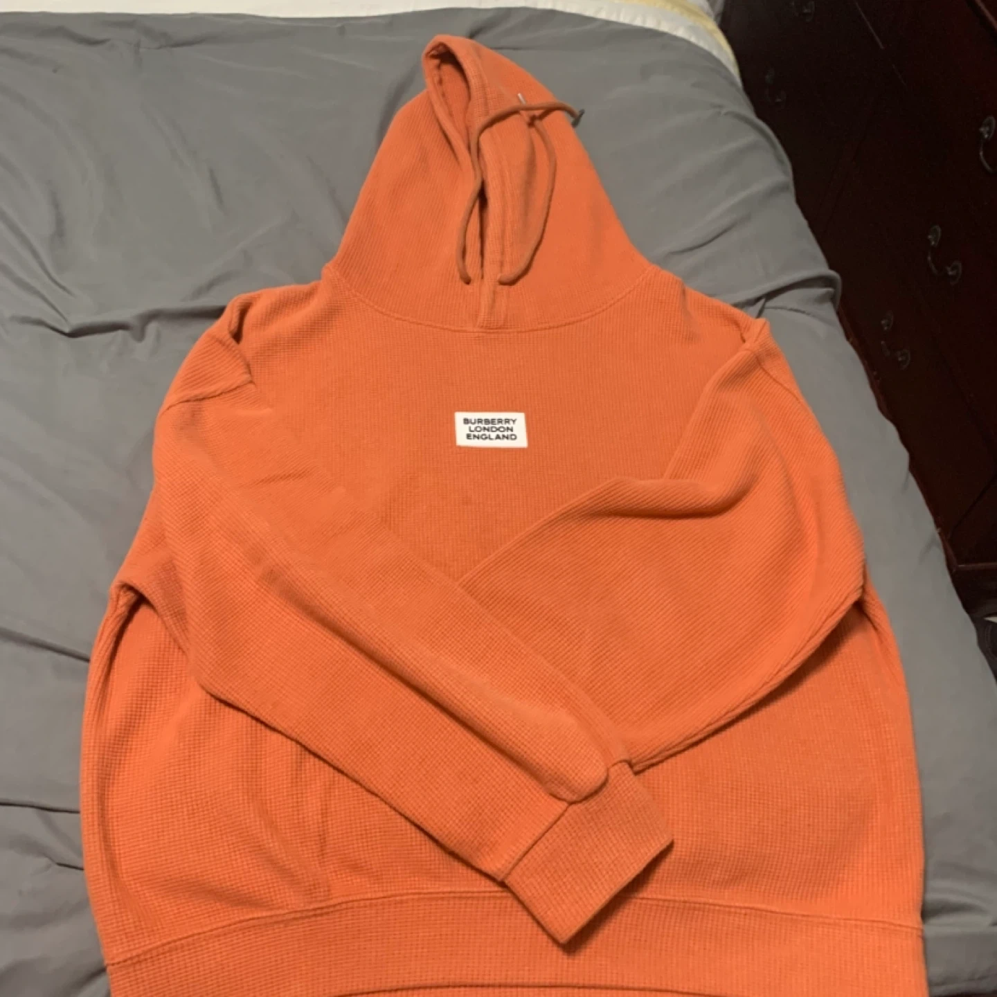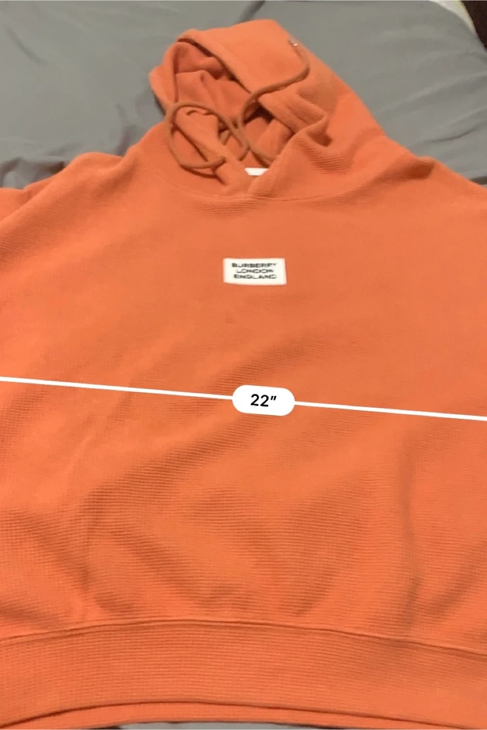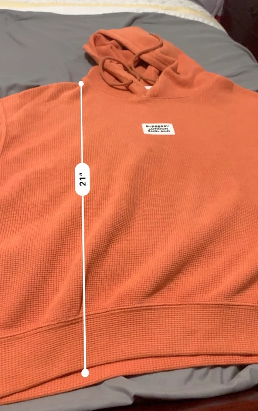 Burberry hoodie in an orange waffle knit. It measures 21" in length and 22" in width. Made of a cotton blend.
