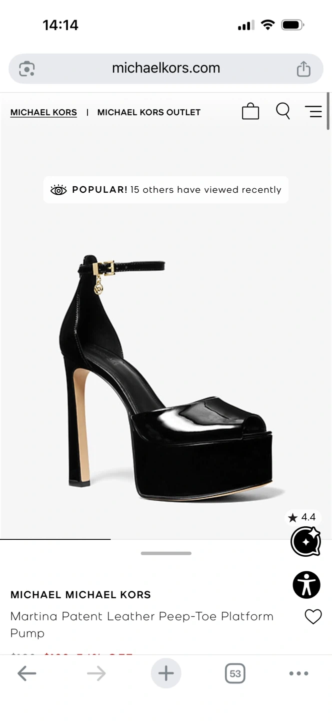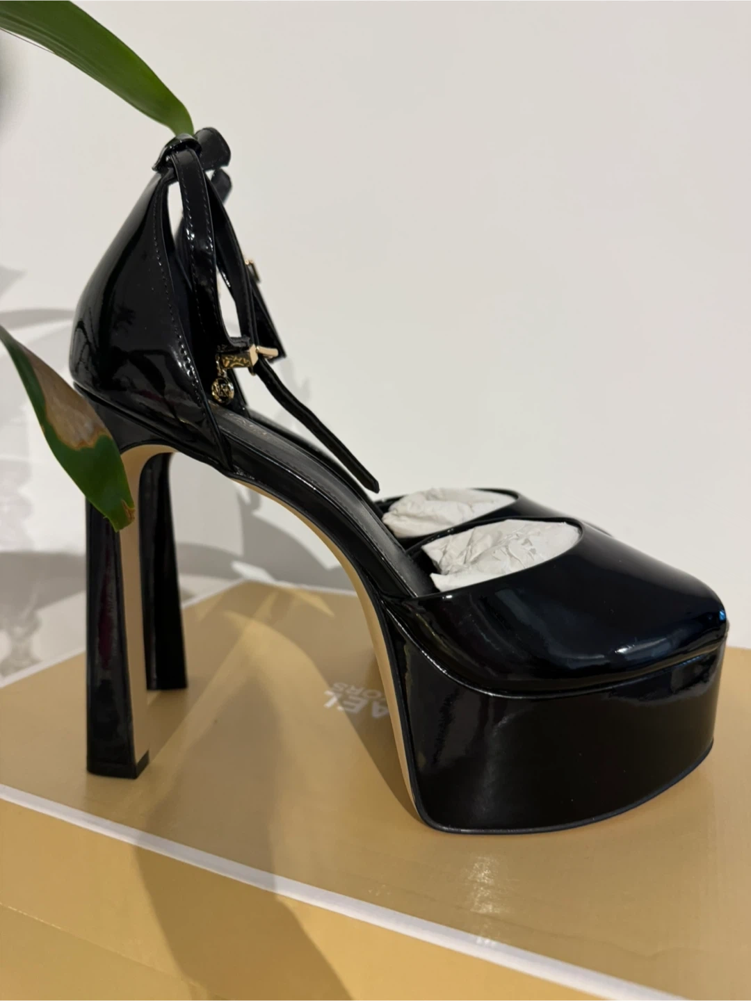 These are a pair of Michael Kors Martina Patent Leather Peep-Toe Platform Pumps.