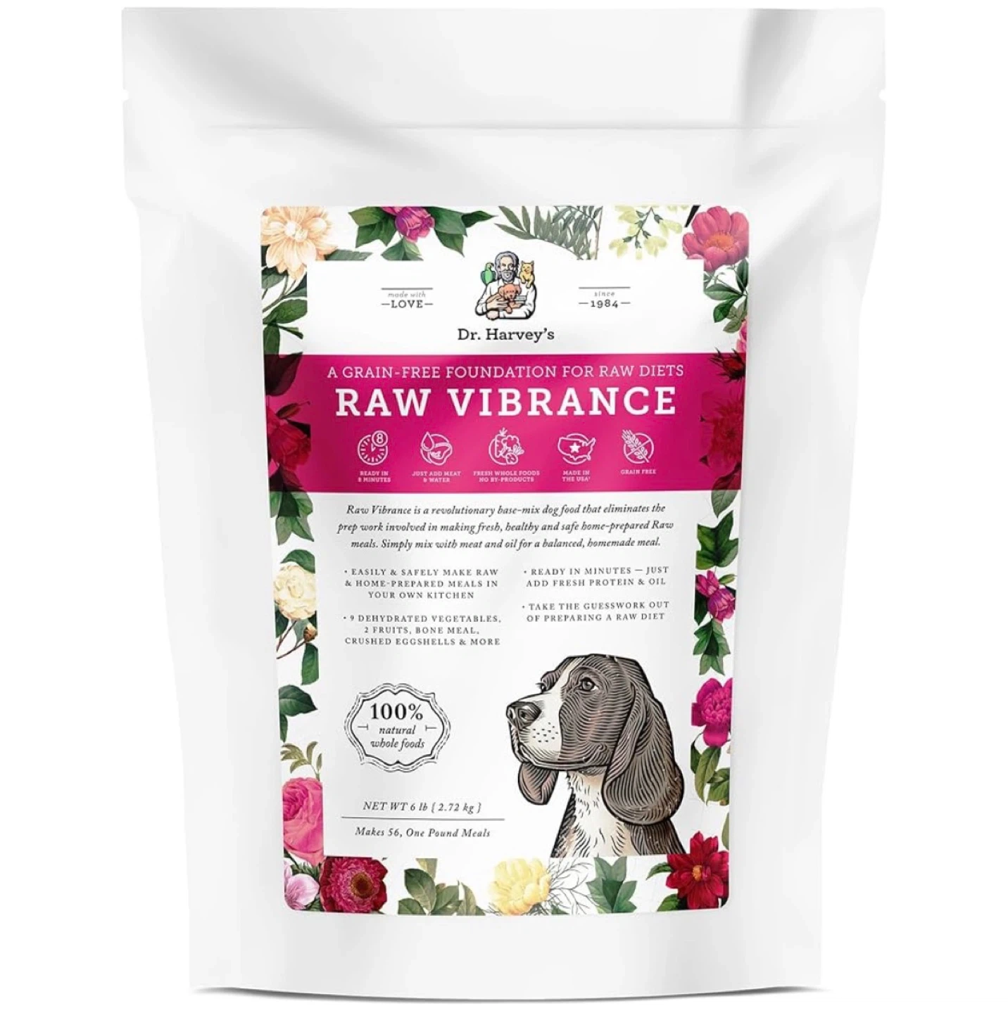 Dr. Harvey's Raw Vibrance is a grain-free foundation mix for raw / cooked dog diets. It's made with 9 nutritious vegetables and 2 antioxidant-rich fruits. This 3 lb bag makes 28 one-pound meals, providing a holistic and natural formula for your furry friend.