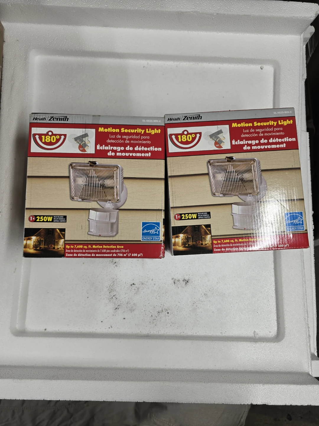 Heath Zenith motion security light with 180° detection and 250W power. It offers up to 7,600 sq. ft. of motion detection area. This light is Energy Star certified.