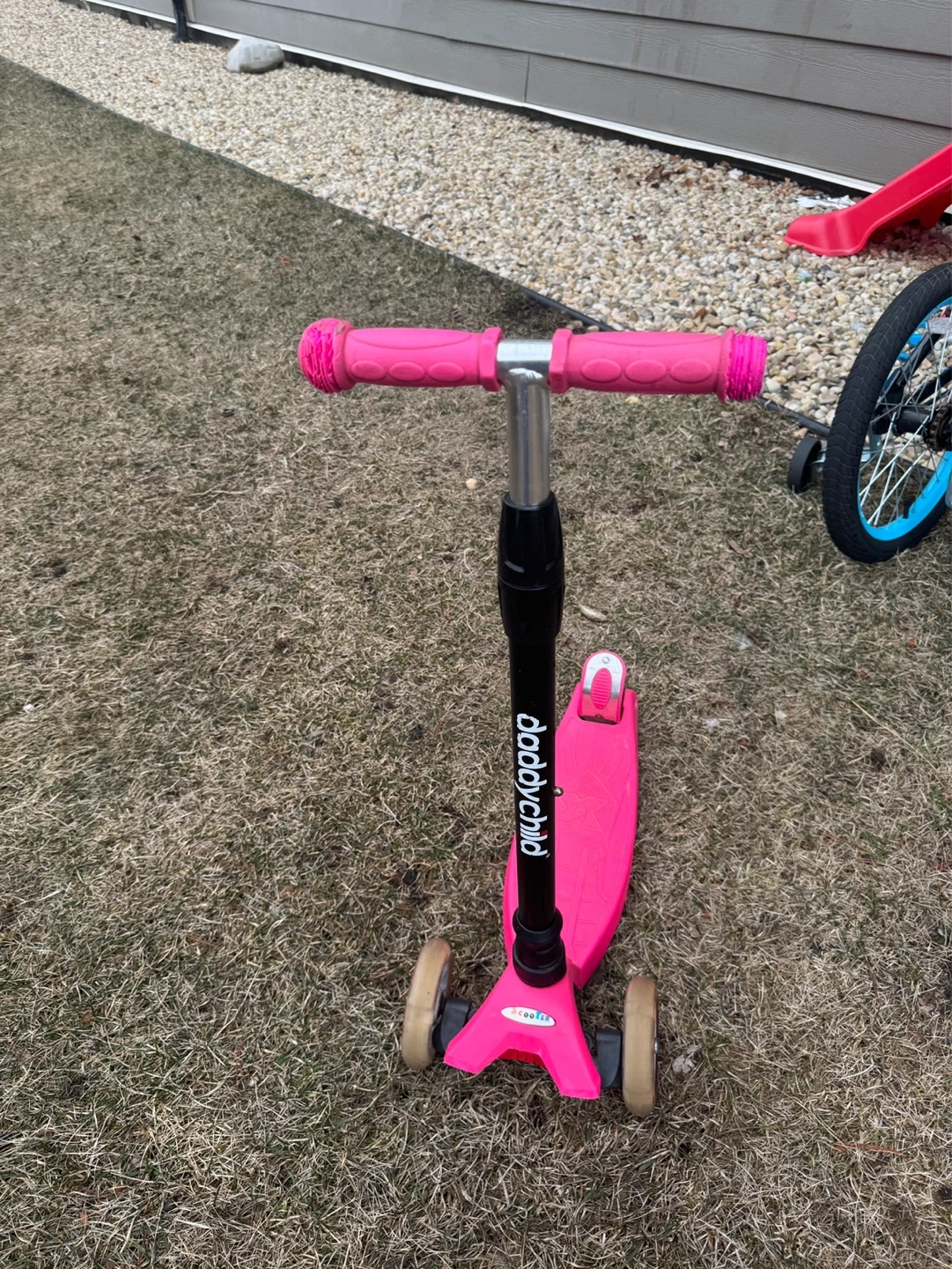 This is a pink three-wheel scooter with adjustable handlebars. It has a sturdy deck and smooth-rolling wheels for easy gliding. A fun way for kids to get around!