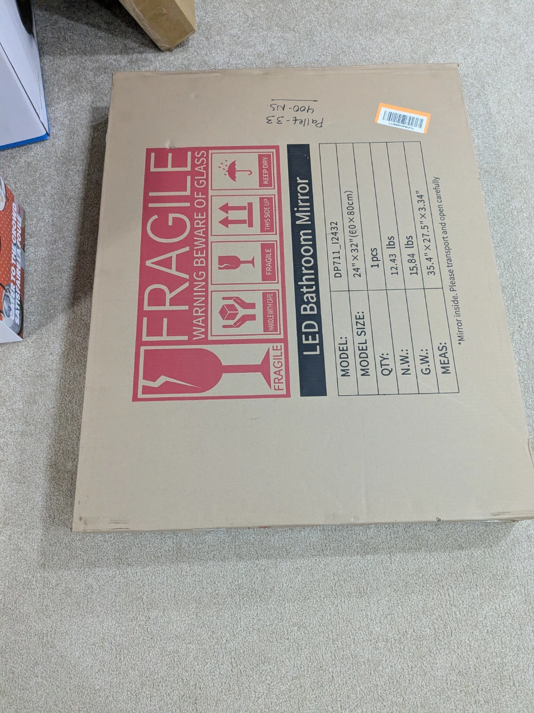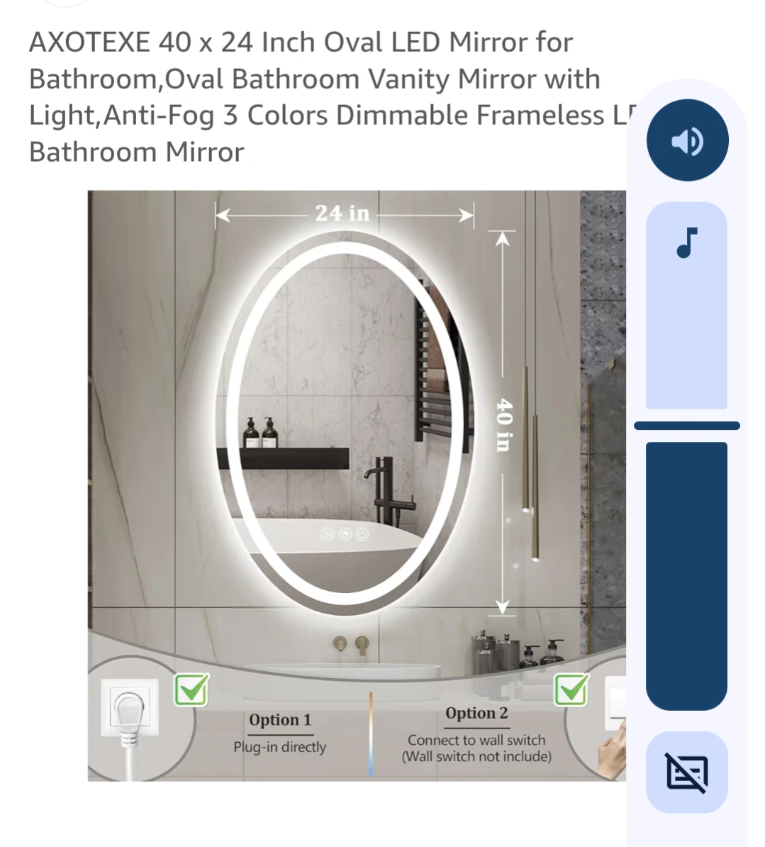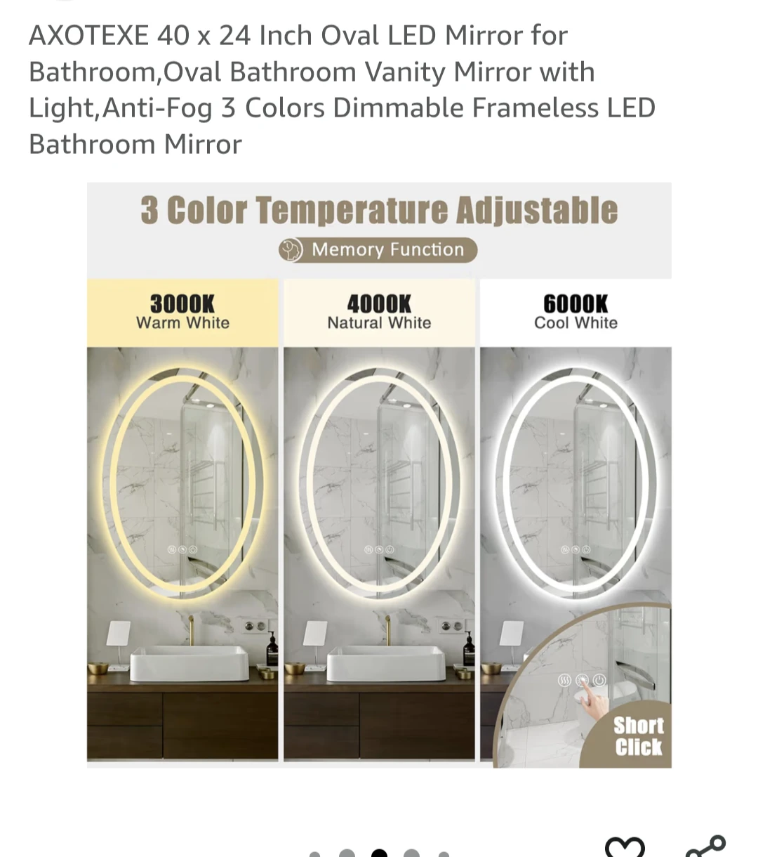 Selling an AXOTEXE LED bathroom mirror. It's an oval bathroom vanity mirror with light and anti-fog features. It has 3 colour dimmable frameless LED options. The mirror inside the box is transported and opened carefully. It measures 24inch wide 32inch length