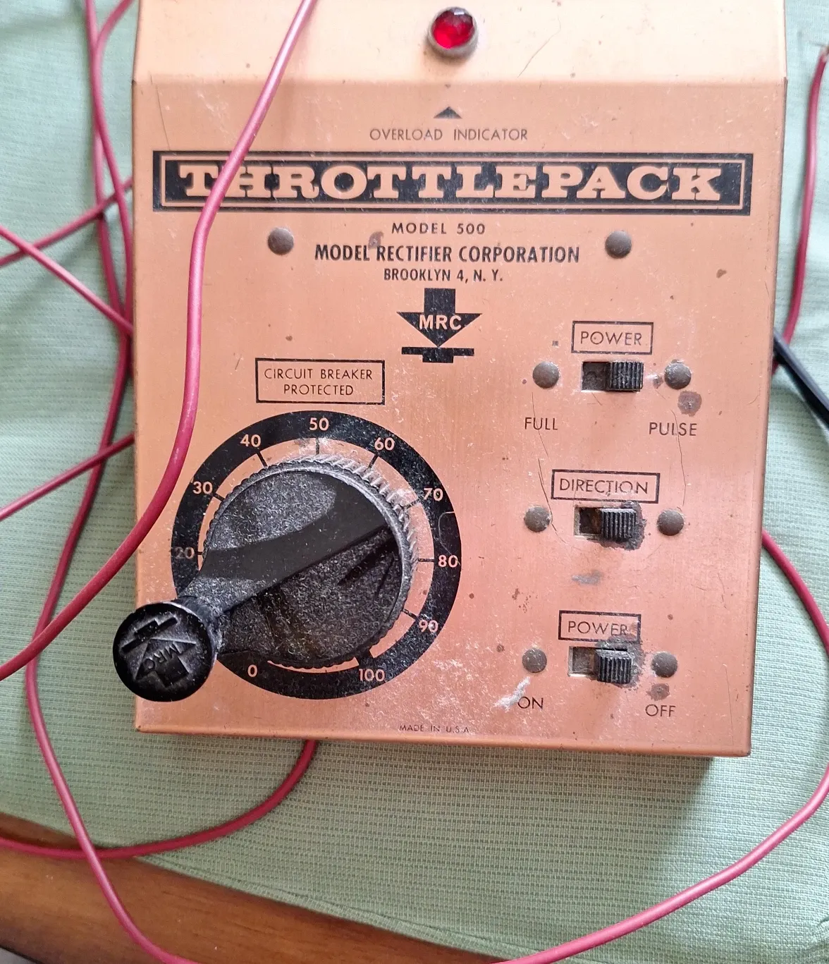This is an MRC ThrottlePack Model 500 train controller. It's circuit breaker protected and made in the USA. Includes power and direction controls, with a 0-100 speed dial.