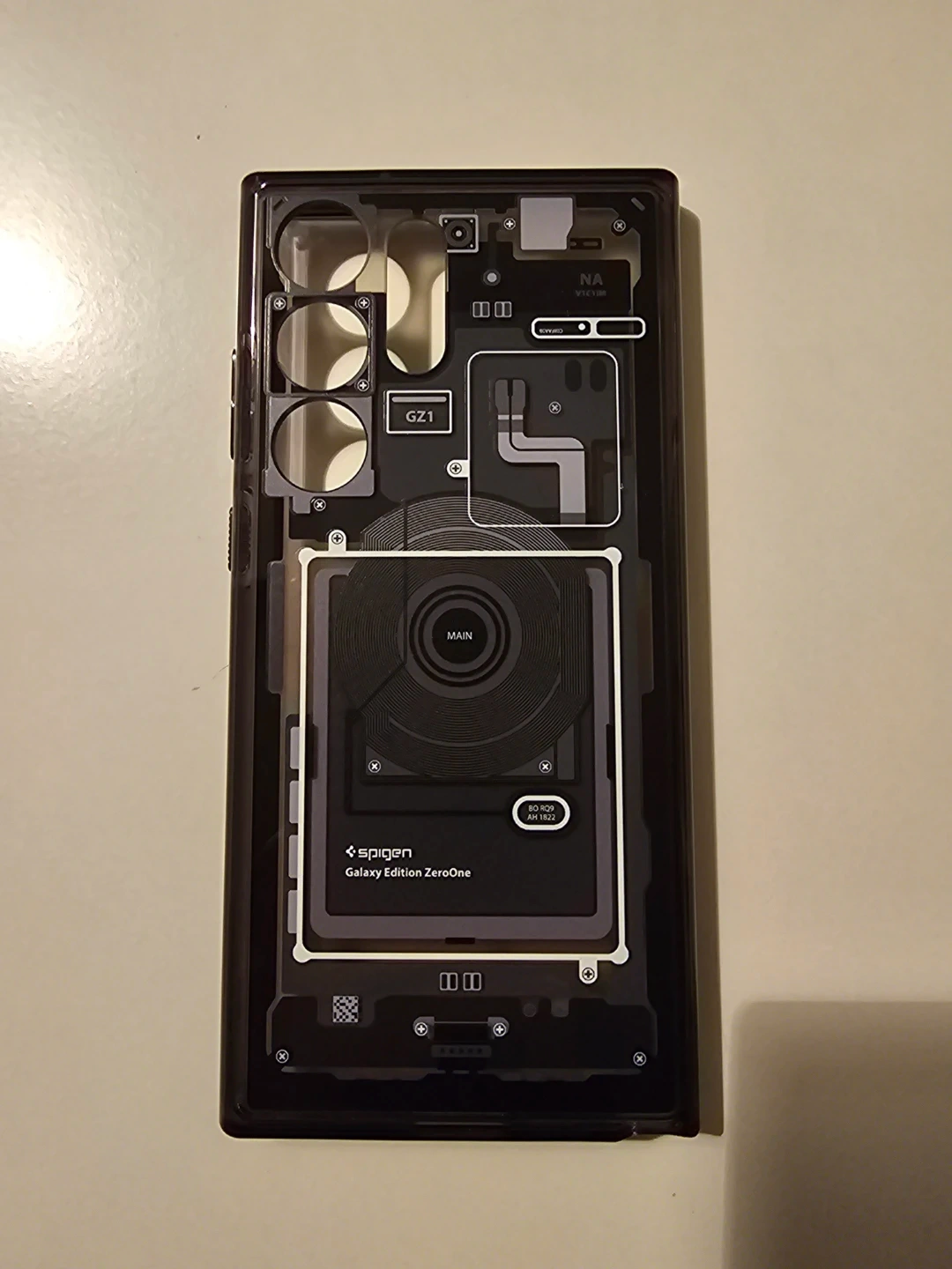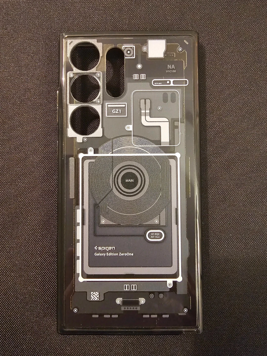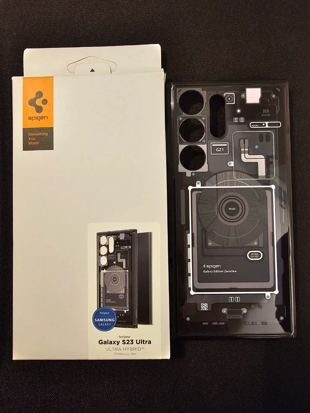 This is a Spigen Galaxy Edition ZeroOne case designed for a Samsung S23 Ultra phone. It features a transparent design showcasing internal components. Made from durable materials to protect your device.