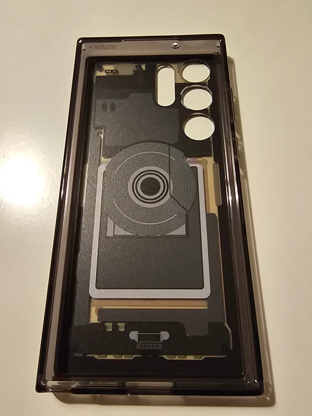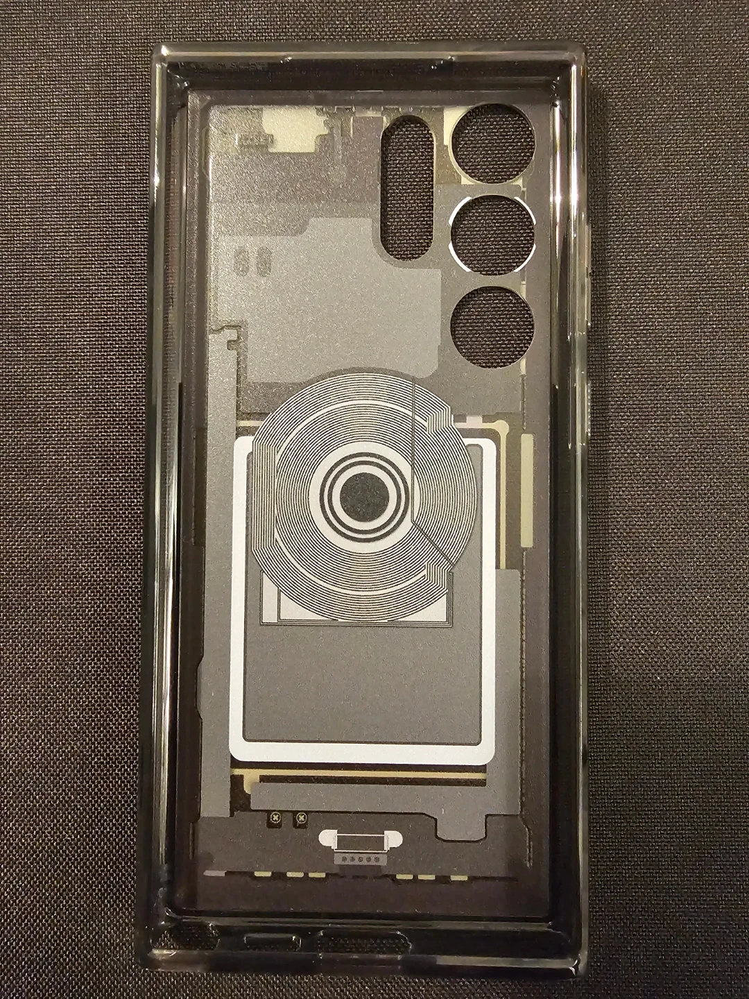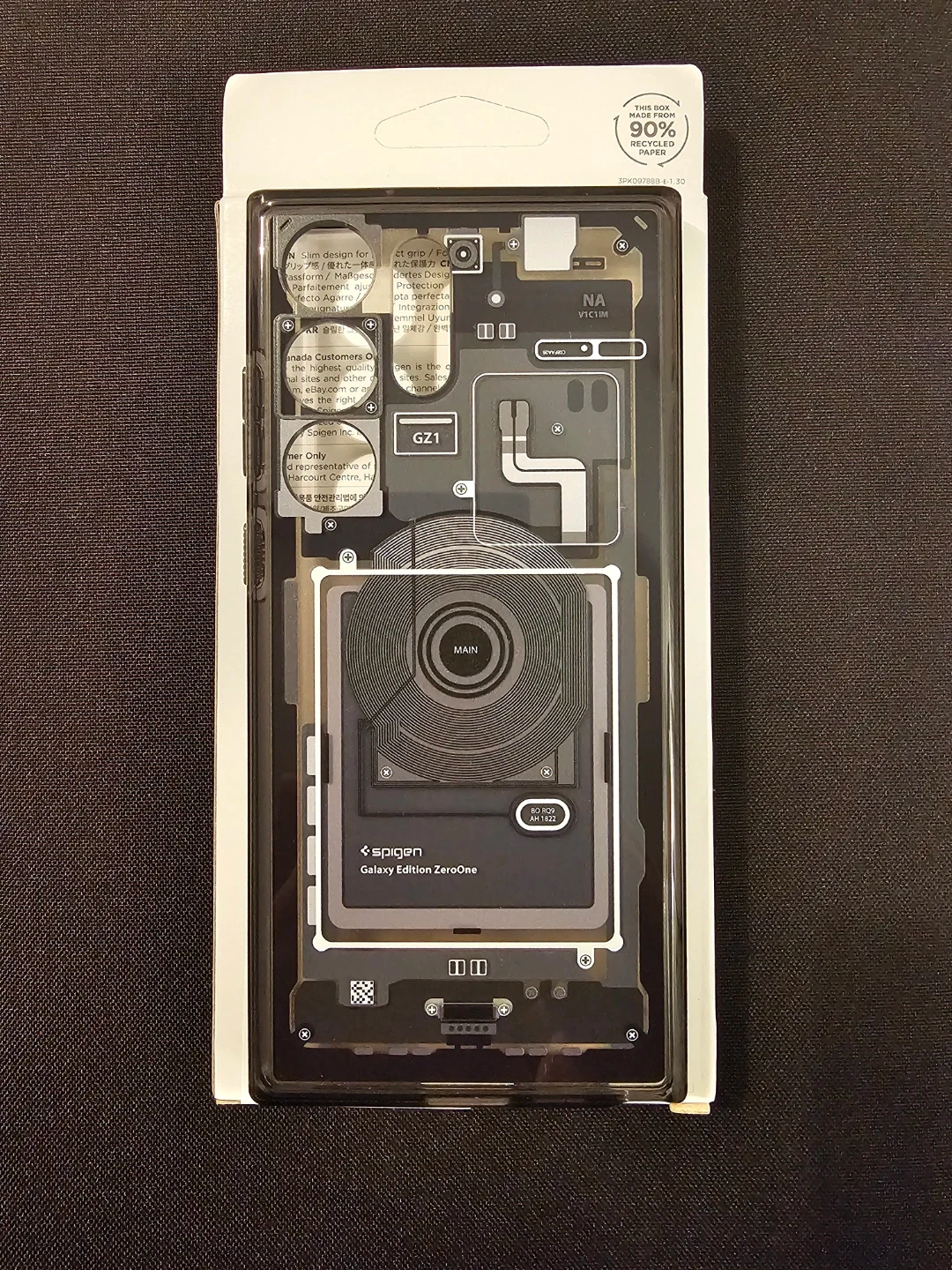 This is a Spigen Galaxy Edition ZeroOne case designed for a Samsung S23 Ultra phone. It features a transparent design showcasing internal components. Made from durable materials to protect your device.