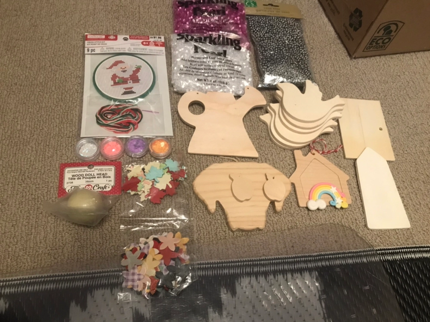 This crafting bundle includes a cross-stitch kit with Santa, a wood doll head, and various wooden shapes 6 doves sheep, and house with a rainbow. It also comes with glitter, small leaf shapes, and flower shapes for decoration. Great for various DIY projects!