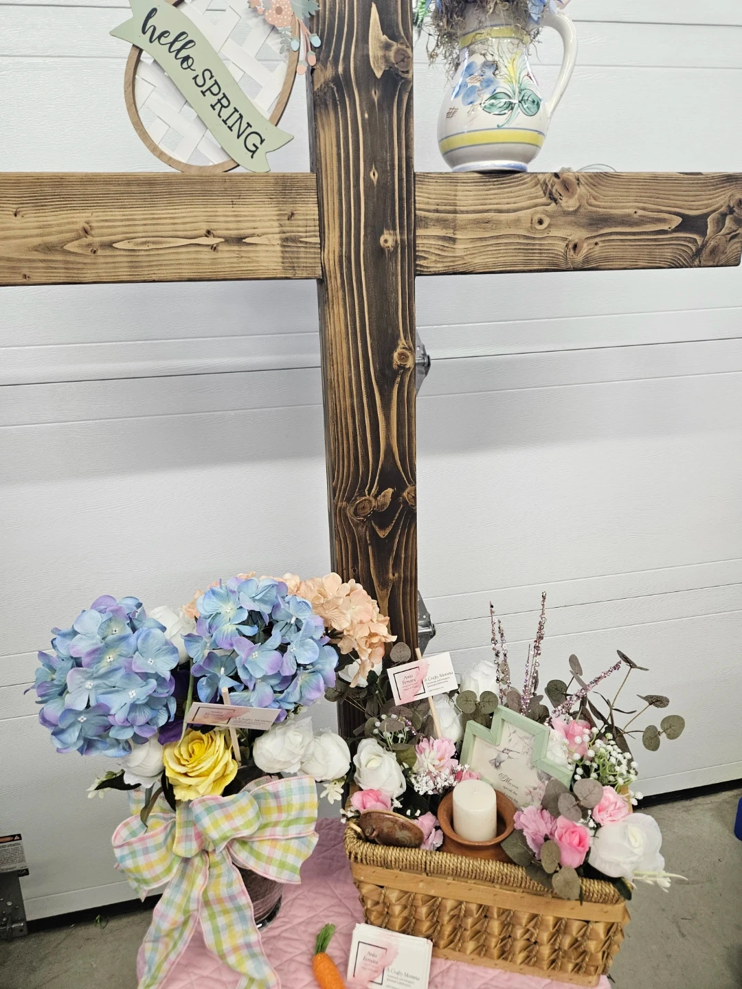 A beautiful wooden cross adorned with a lovely spring floral arrangement, featuring hydrangeas, roses. This piece is perfect for adding a touch of seasonal cheer to your home!