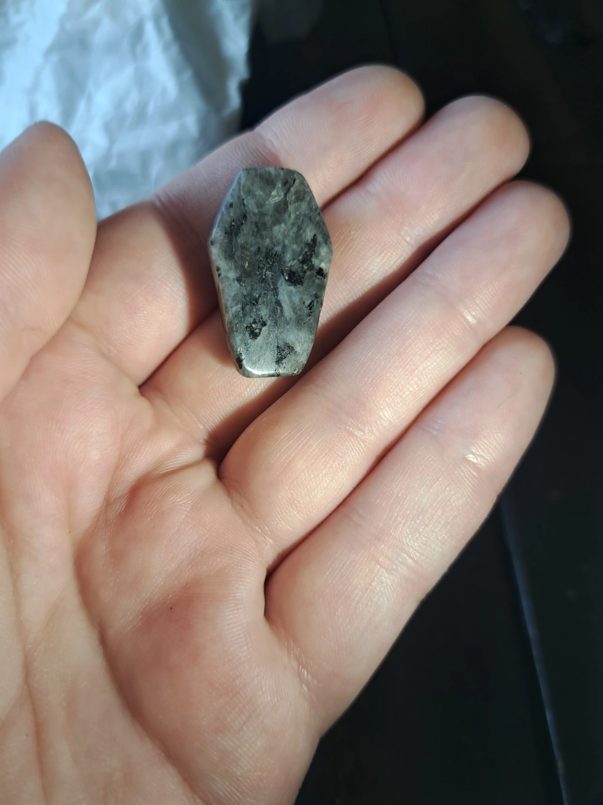 Here is a small stone coffin figurine. It's a unique piece that could be used as a decorative item or as part of a collection! It has a smooth finish and a dark grey colour with some lighter grey marbling throughout