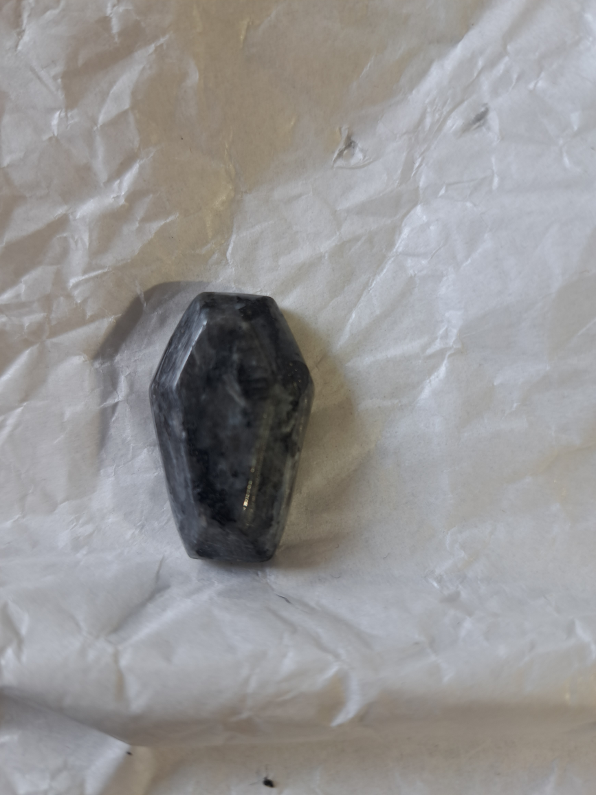 Here is a small stone coffin figurine. It's a unique piece that could be used as a decorative item or as part of a collection! It has a smooth finish and a dark grey colour with some lighter grey marbling throughout