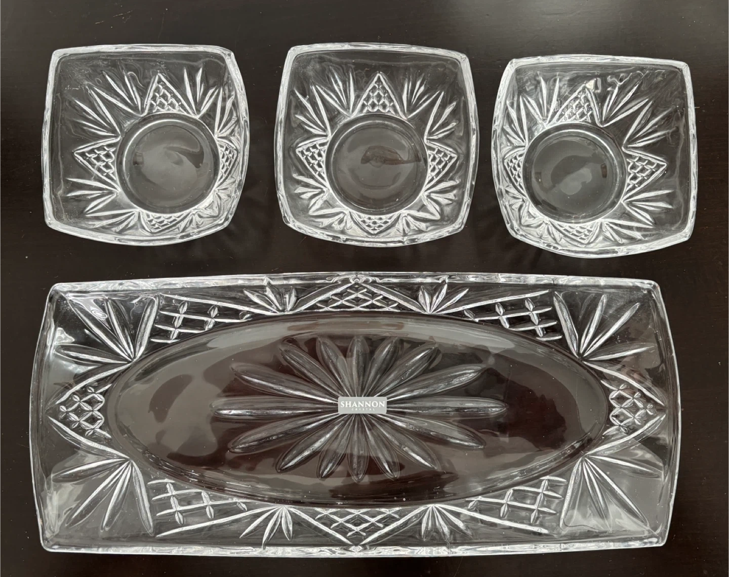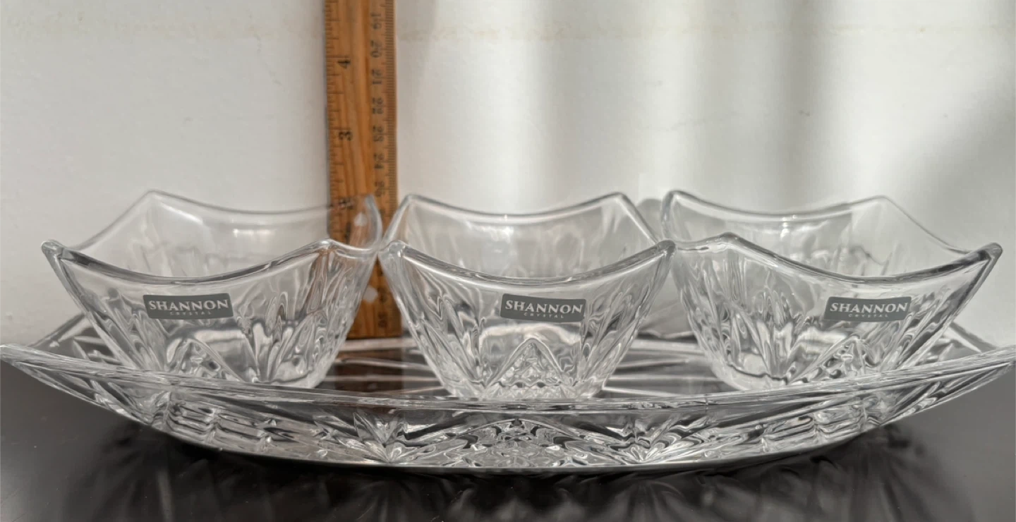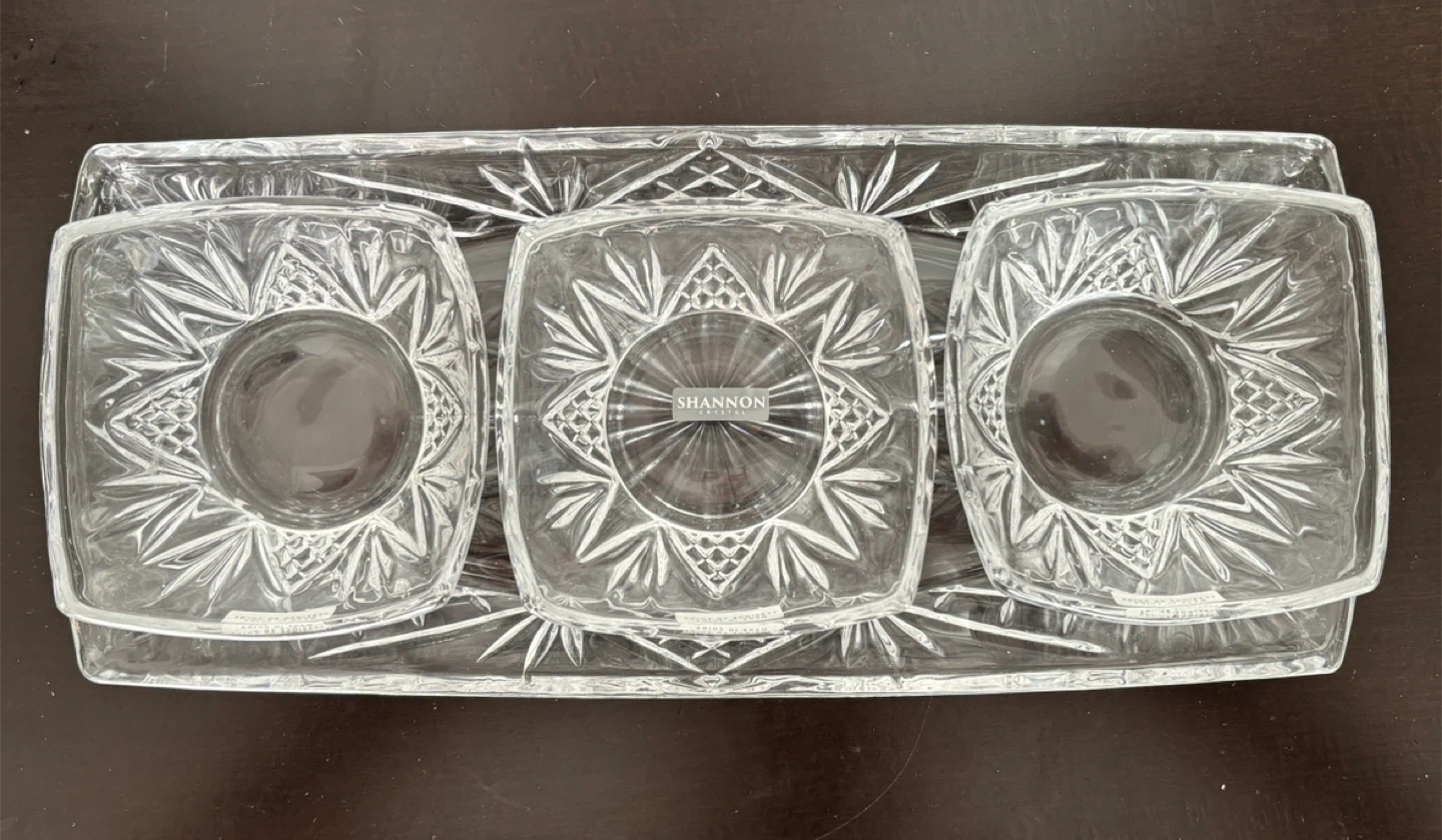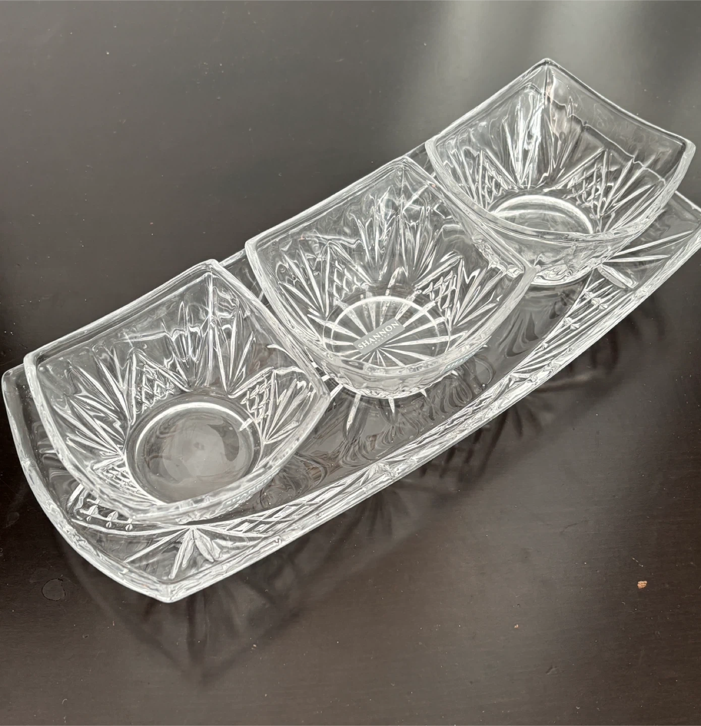 Buy & SellShannon Crystal Chip and Dip Platter SetShannon Crystal Chip and Dip Platter Set$30Shannon Crystal serving set includes a rectangular platter and three square bowls. New never used.ConditionNewWHERE TO MEETCheck LocationView MapSELLERNickCedarvale1000+229 reviews0 chats·0 favorites·3 viewsSEND CHAT TO SELLERHi Nick! I’m interested in your listing.Hi Nick! I’m interested in your listing.Get the Karrot app to chatSign In to chat