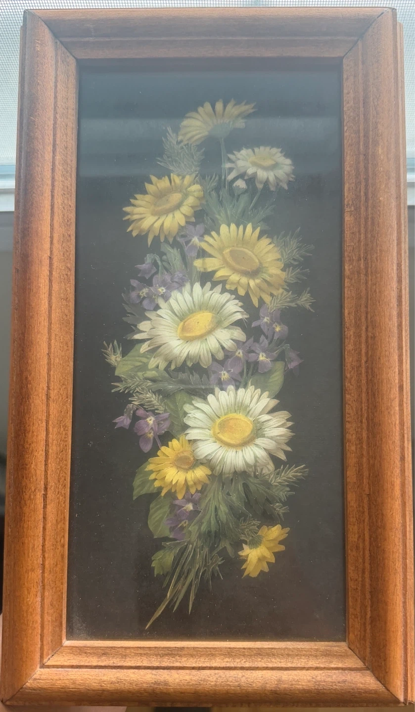 A charming framed print featuring a bouquet of daisies and poppies on a dark background. The wooden frame complements the floral design. This piece adds a touch of nature's beauty to any room.