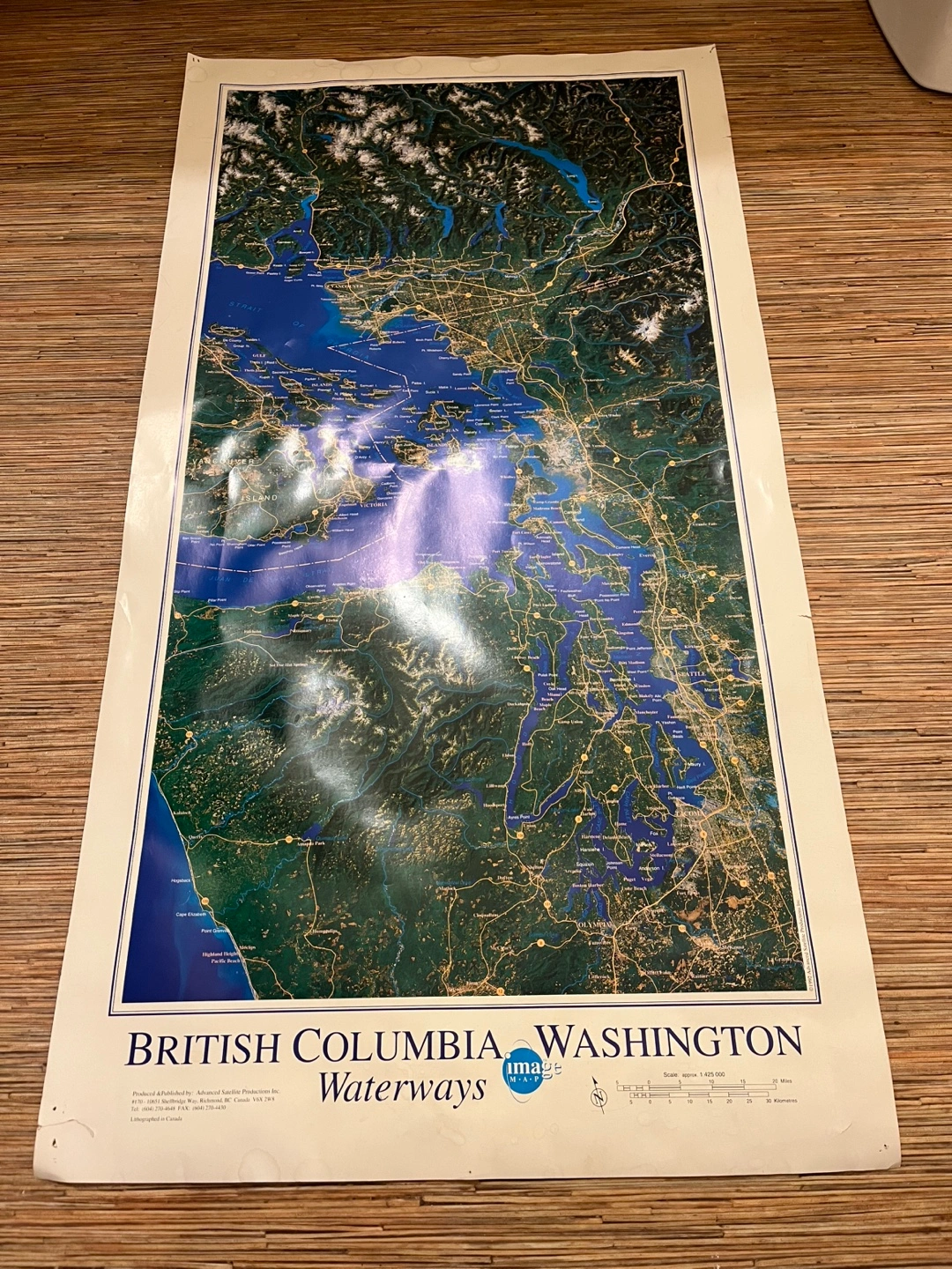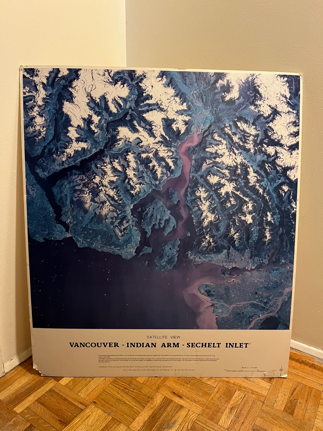 Set of three large-format vintage satellite view maps. Depicts Vancouver, Indian Arm, Sechelt Inlet, and British Columbia & Washington waterways. Shows geographical features and details. Some minor wear.
