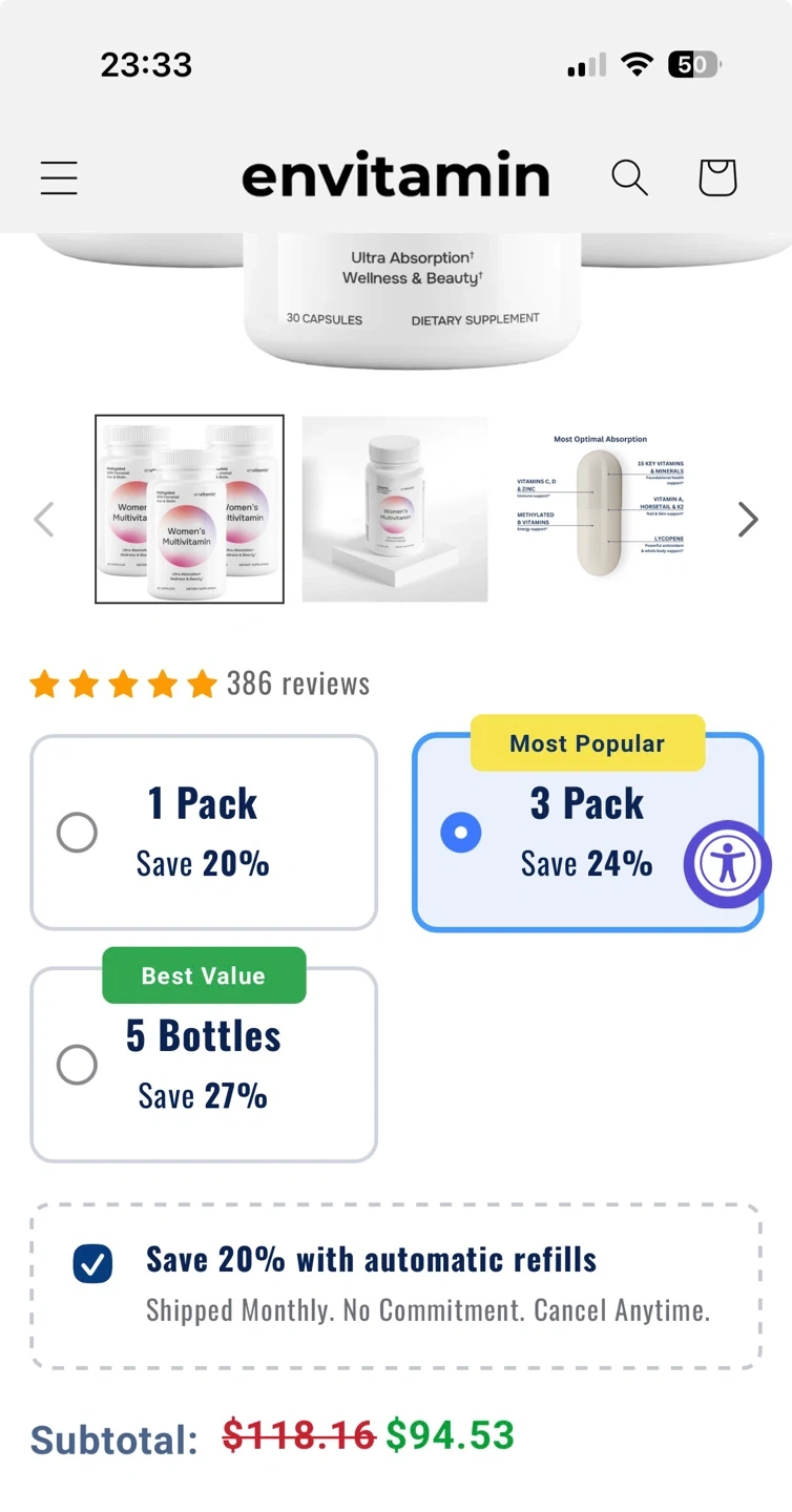 This envitamin Women's Multivitamin provides ultra absorption for wellness and beauty. It contains 15 key vitamins & minerals, including Vitamin C, D, Zinc, and Methylated B Vitamins. Each bottle has 30 capsules, with one serving per capsule.