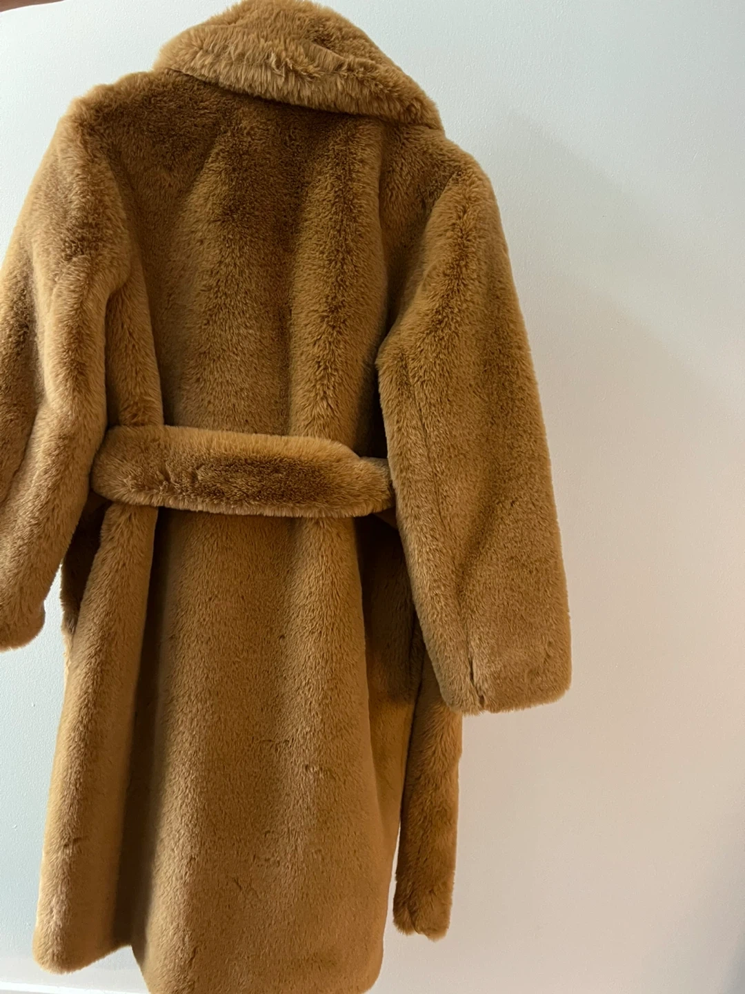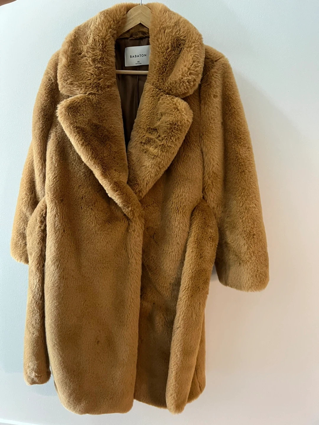 This is a stylish brown faux fur coat from Babaton. It features a tie belt for cinching the waist. Fully lined for extra warmth. Perfect for cooler weather!
