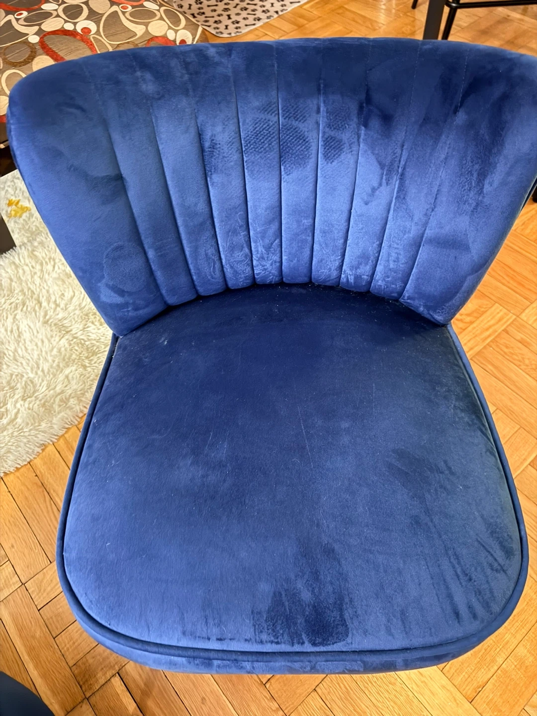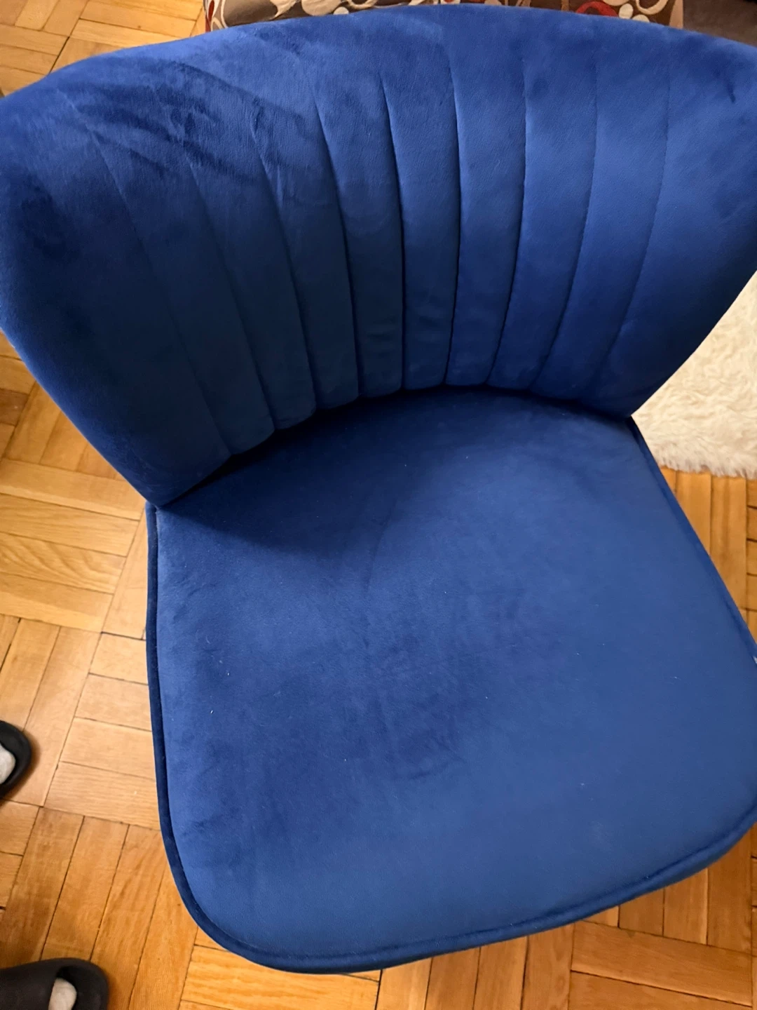 Stylish blue velvet accent chair with gold legs. Overall dimensions are 27.4" (69.5 cm) high, 20.9" (53 cm) wide, and 27.4" (69.5 cm) deep. Seat dimensions are 17.1" (43.5 cm) high and 20.9" (53 cm) wide. Adds a pop of colour to any room!