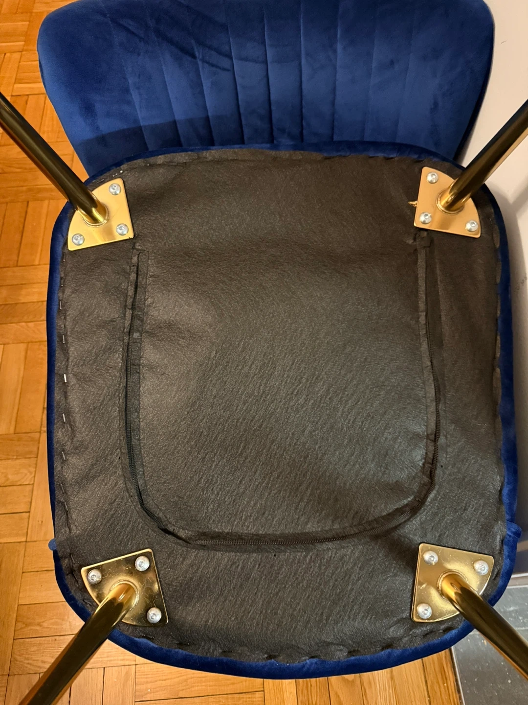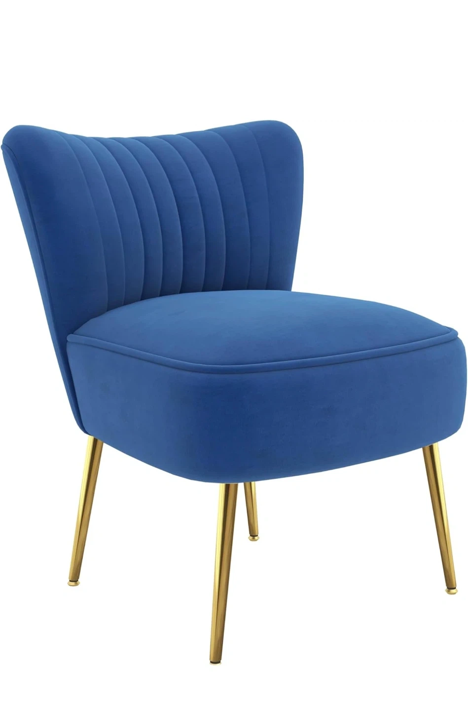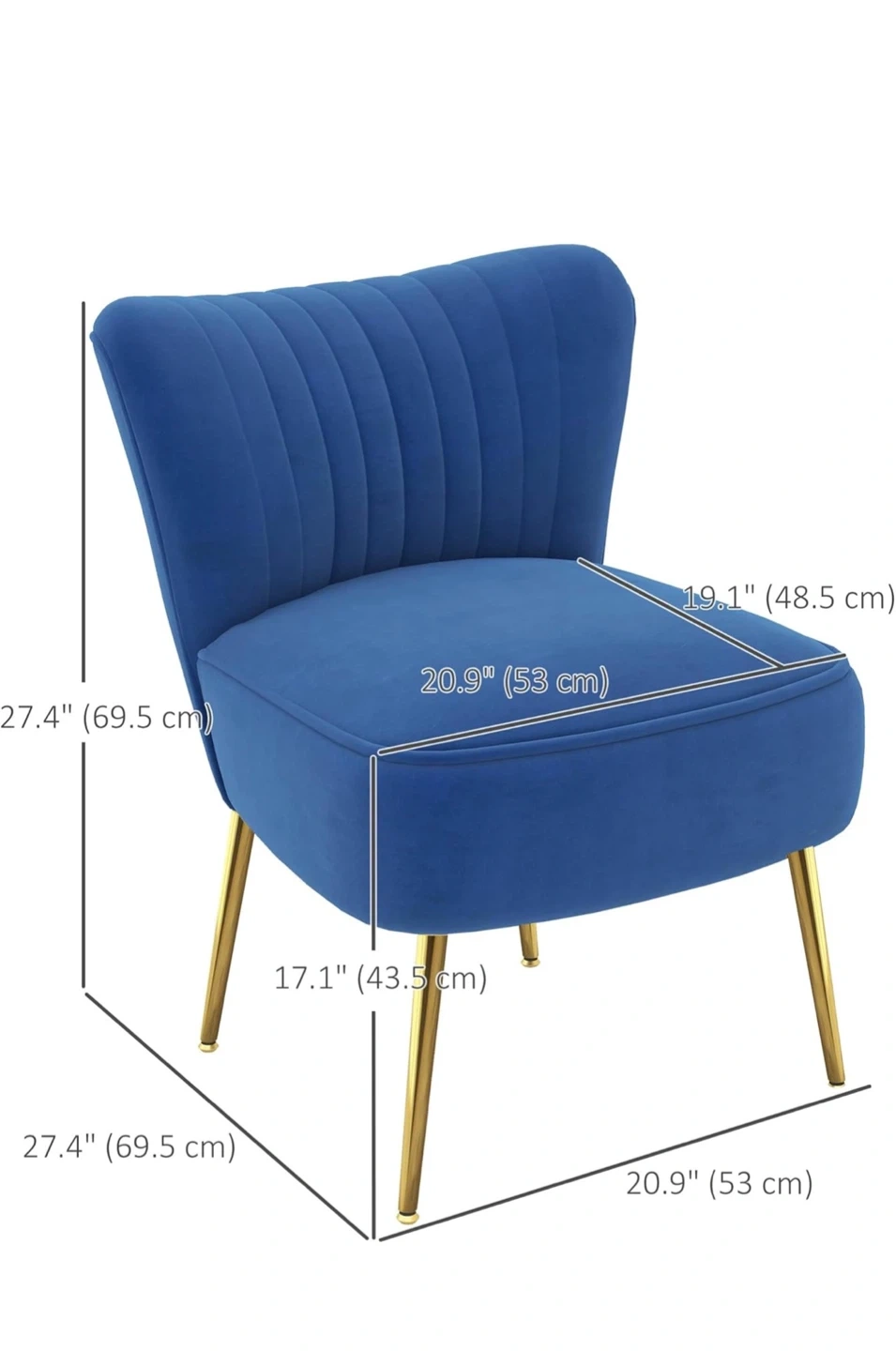 Stylish blue velvet accent chair with gold legs. Overall dimensions are 27.4" (69.5 cm) high, 20.9" (53 cm) wide, and 27.4" (69.5 cm) deep. Seat dimensions are 17.1" (43.5 cm) high and 20.9" (53 cm) wide. Adds a pop of colour to any room!