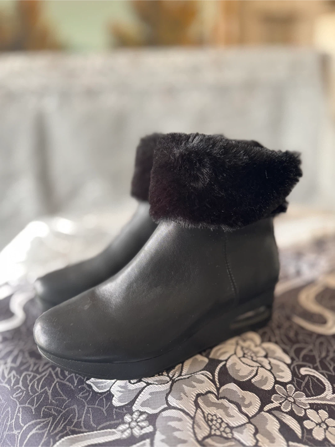 Stylish black ankle boots featuring a cozy fur trim and decorative back zippers. The faux leather upper and comfortable wedge heel make them a great choice for everyday wear.