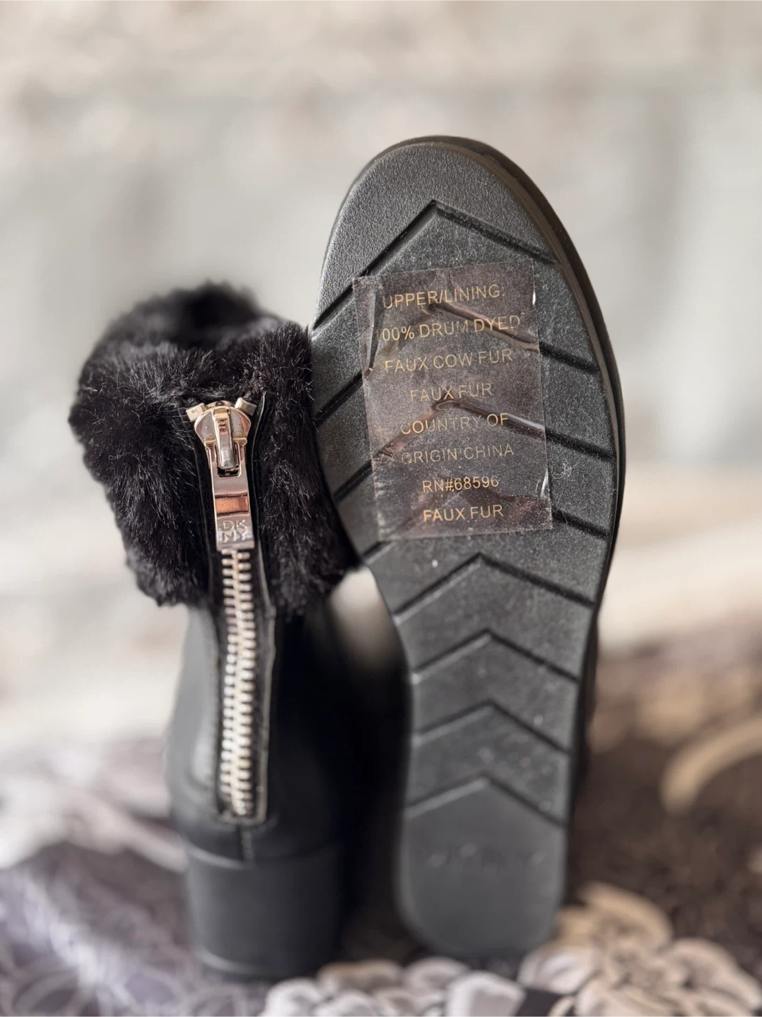 DKNY Black Ankle Boots with Fur Trim and Zippers