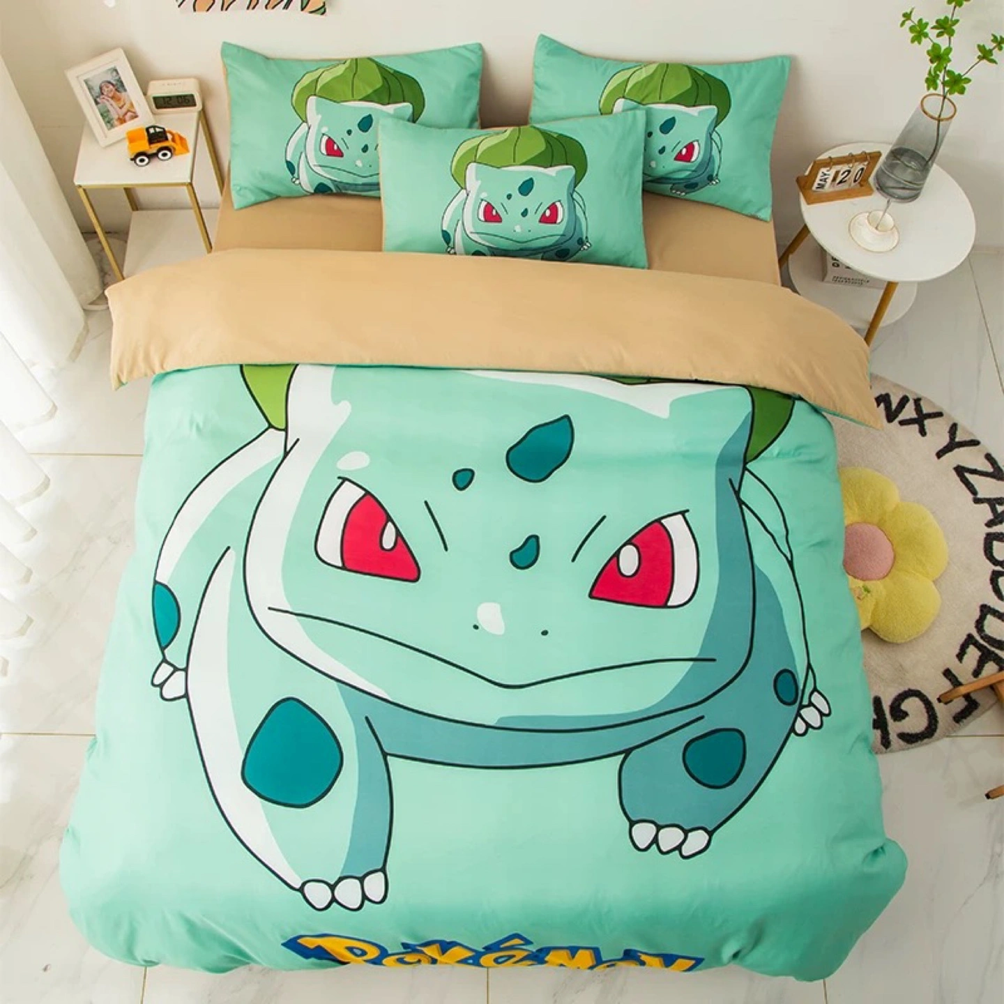Brand new / washed once Bulbasaur themed bedding set. Includes duvet cover, fitted sheet (brownish beige), and standard pillowcases. Washed it and found out I completely bought the wrong size. Believe this fits a queen