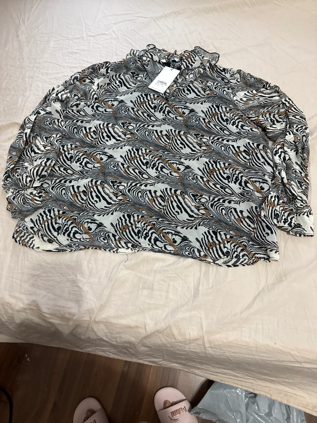 This is a women's long sleeve blouse with a unique all-over pattern. It features ruffled details along the neckline and sleeves. Polyester blend fabric.