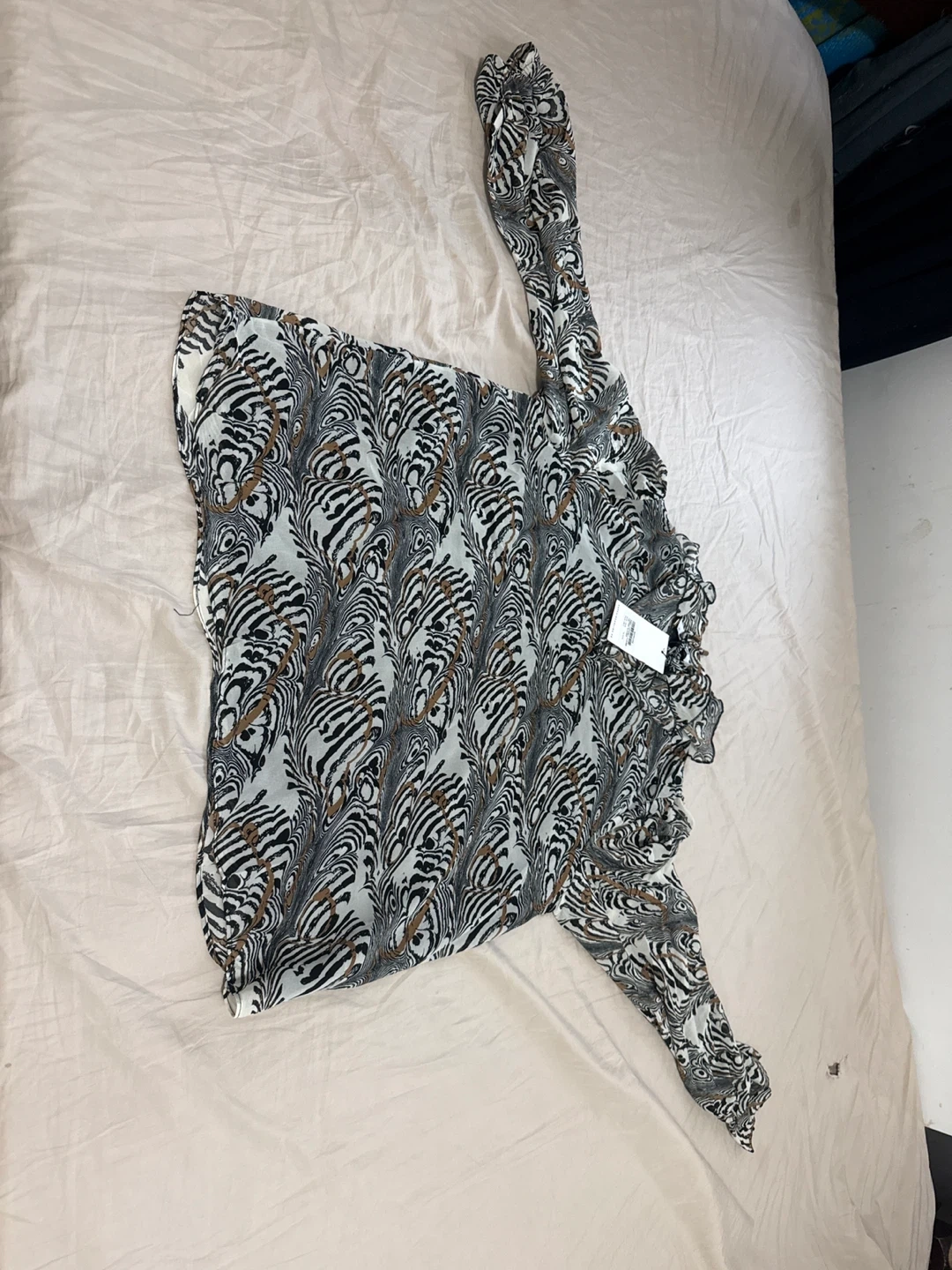 This is a women's long sleeve blouse with a unique all-over pattern. It features ruffled details along the neckline and sleeves. Polyester blend fabric.
