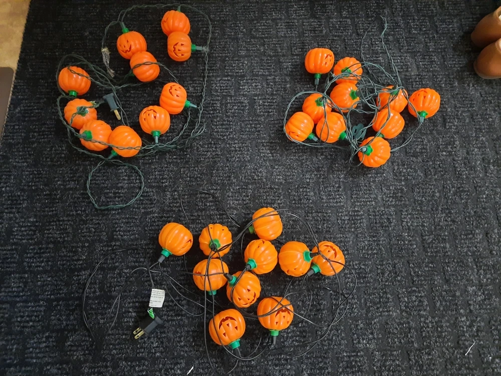 2 x 11ft string lights, 1 x 9.5ft string lights. $5/all. All work except for 1 pumpkin light bulb. Pick up Bayside, Airdrie. Please check my other ads.