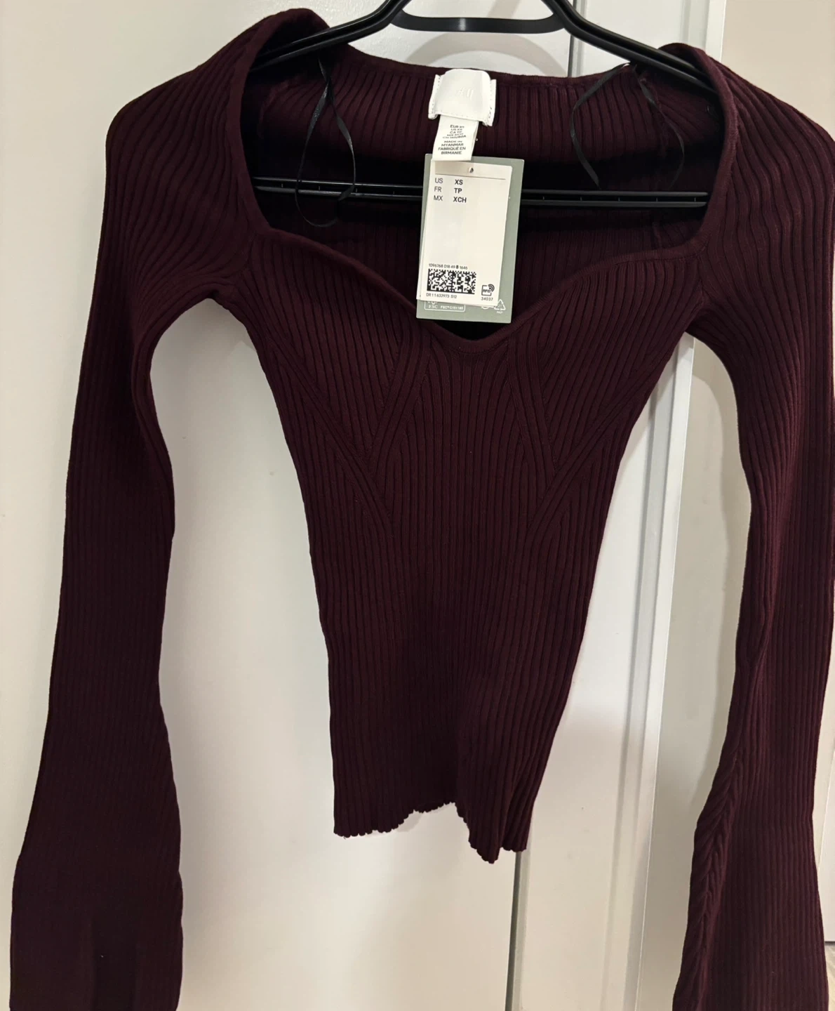 This is a burgundy ribbed knit top from H&M. It features a stylish square neckline and long, flared sleeves. The material is a blend, providing a comfortable fit.
